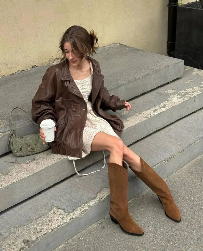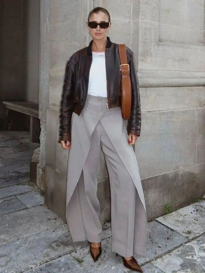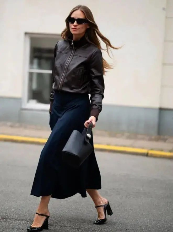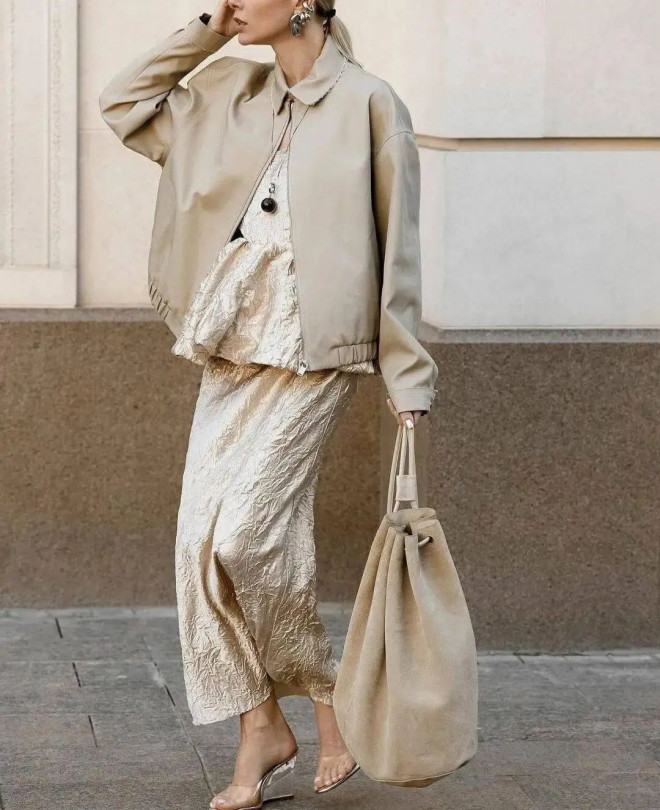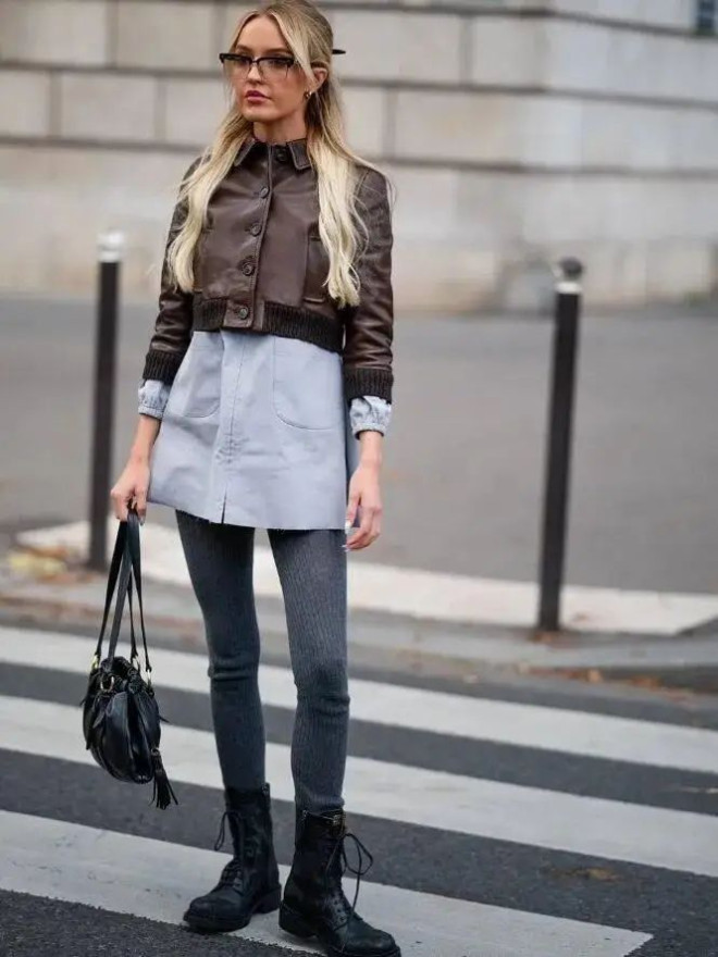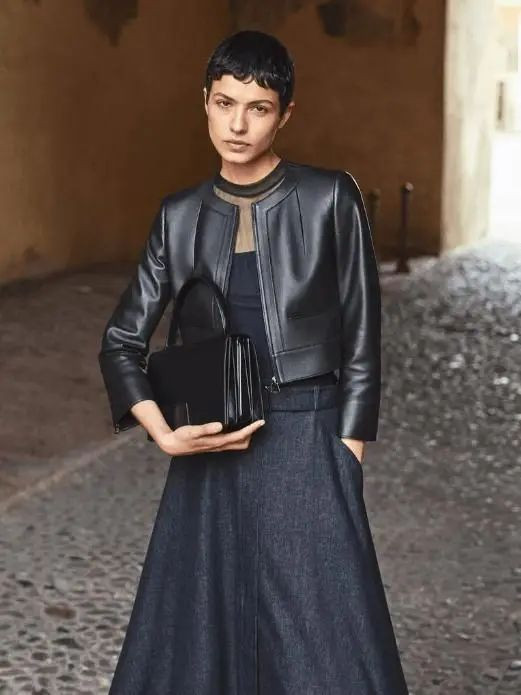 与半裙搭配——包臀裙、伞裙抑或迷你裙,皆能碰撞出别样魅力。皮革的中性感与裙装的柔美相平衡,既保留女性韵味,又注入飒爽个性。