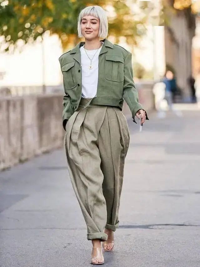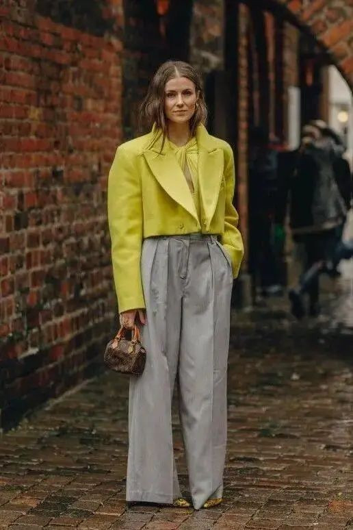 建议首选高腰牛仔裤或西装裤搭配,强调腰线,拉长身形。“正肩”设计提升气场,就连小个子也能穿出好比例。