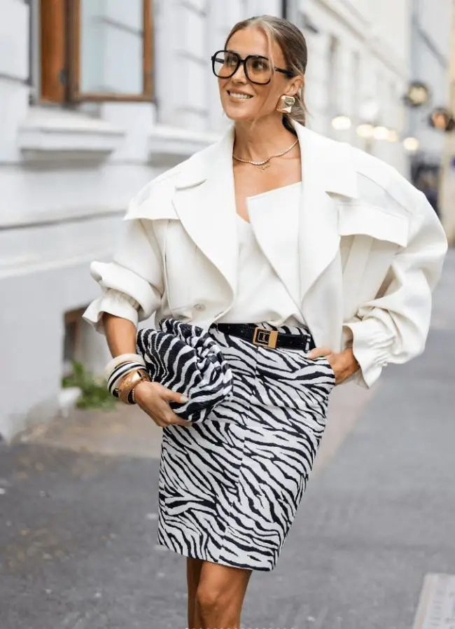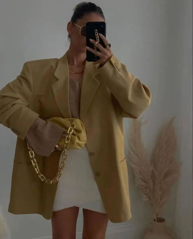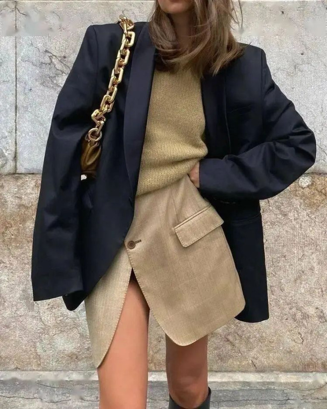 喜欢阔版大外套的穿搭可以参考下面几套,都是阔版型西装外套,搭配了同款半裙或者极具个性的半裙,这种也是下衣失踪的一个穿搭类型,很适合那些肩宽的人来驾驭,穿上超有气场。