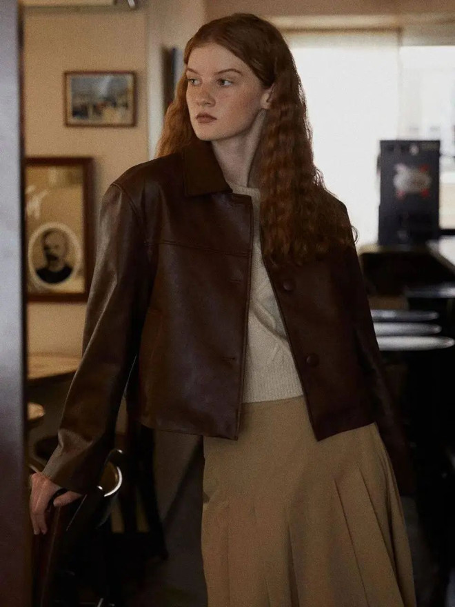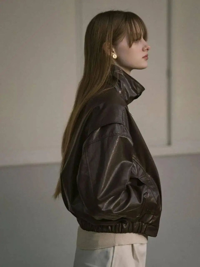 皮革材质本身极具辨识度,而“短一点”的设计显著提高了它的实穿性与搭配力。2025年的短皮外套,在材质与剪裁上更趋多样,可温柔可不羁。