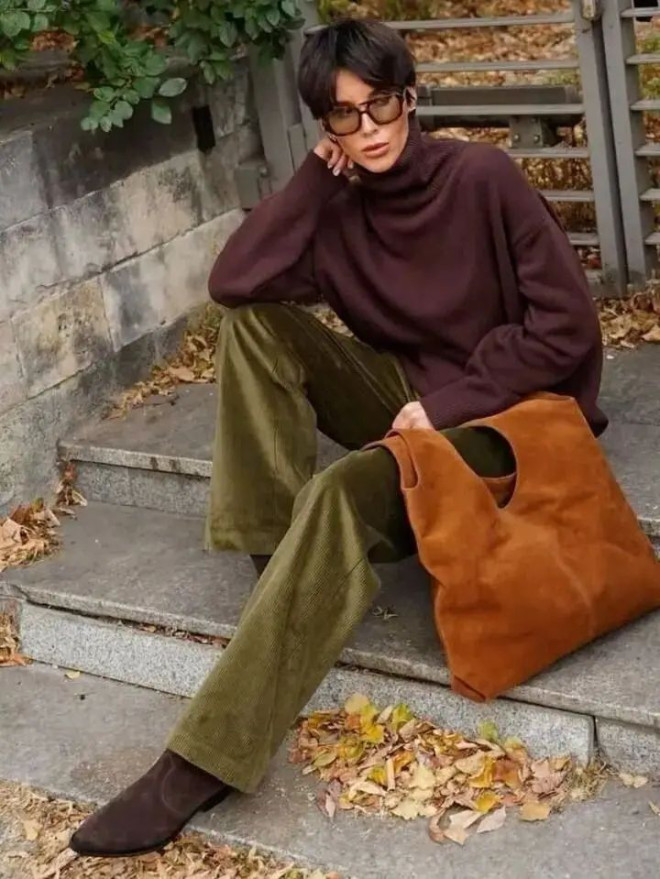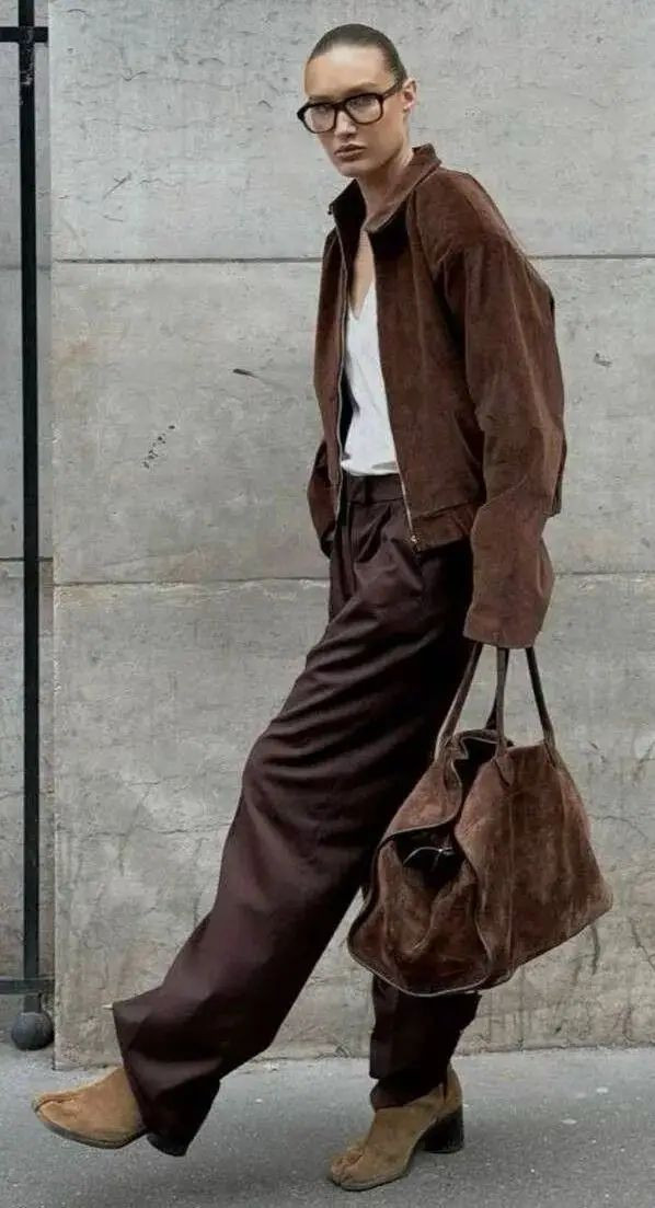 包型有点像“包袱”的即视感,垂坠厚实又有型,偏休闲一点,但却也十分百搭有范。无论搭配衬衫、风衣、毛衣还是厚外套,麂皮质感永远是秋冬的加分项。