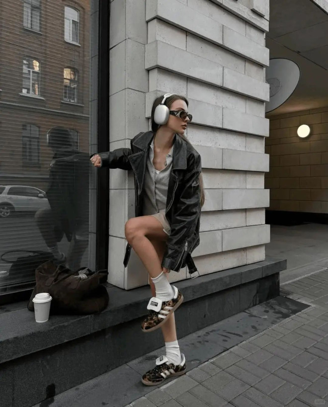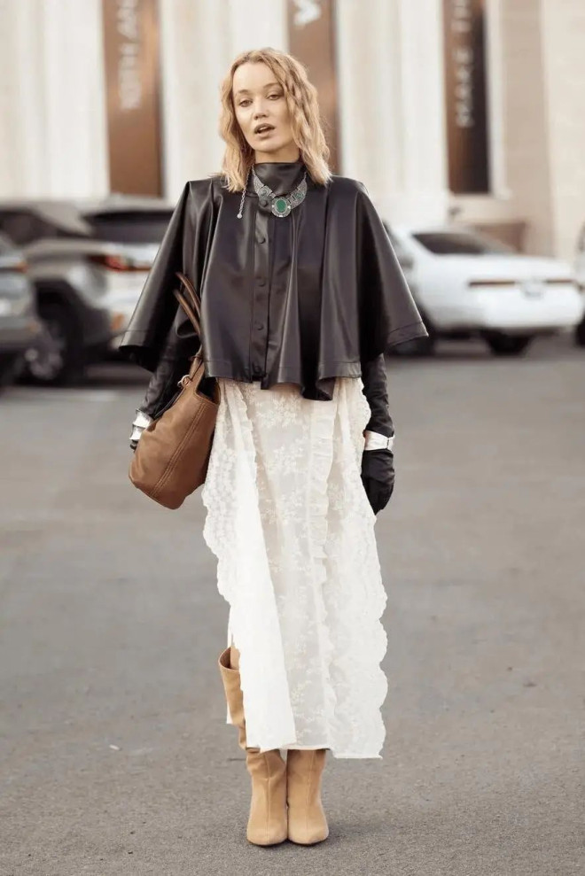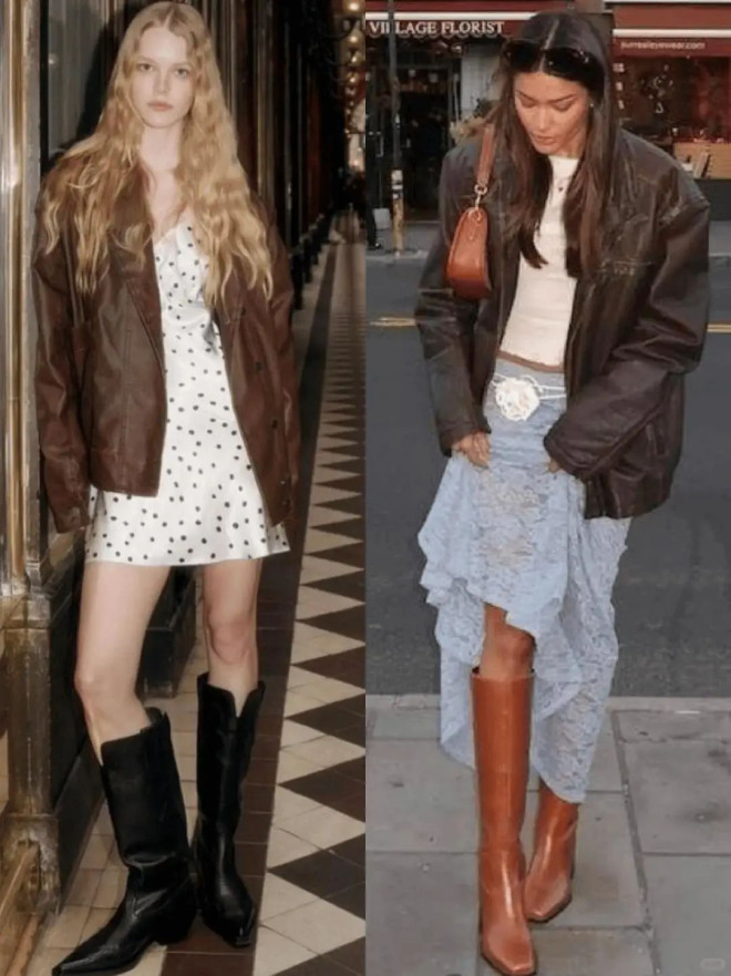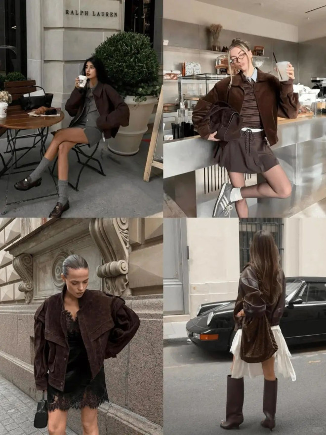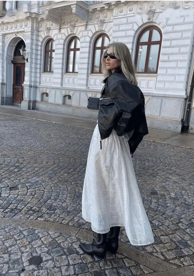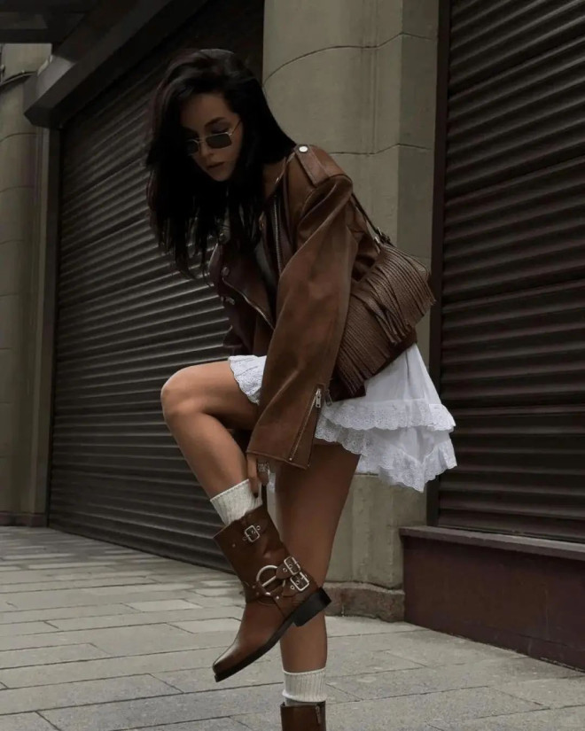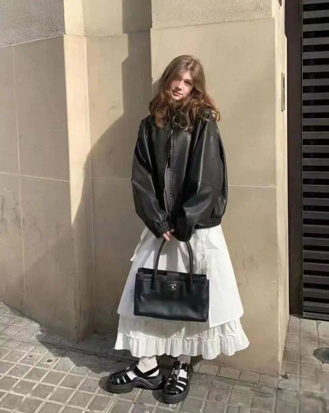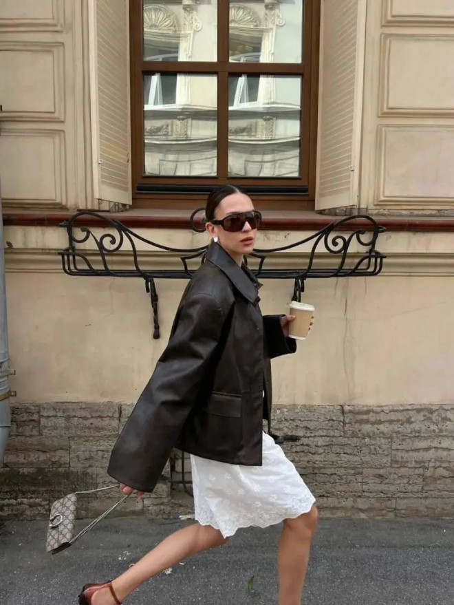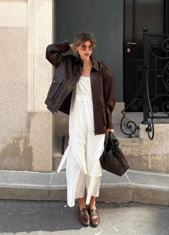 阔版棕色机车外套兼具复古韵味与摩登气质,与小白裙搭配,展现出温柔又硬朗的独特质感。