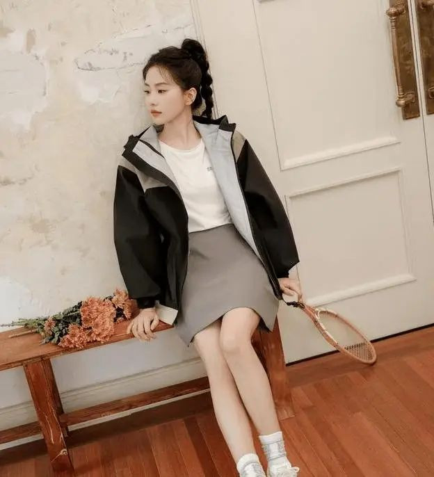 夹克长度建议在臀部一半位置,裙长最好露出10–15cm腿部,如短裙至大腿中段、迷笛裙至小腿肚,视觉更显高。
