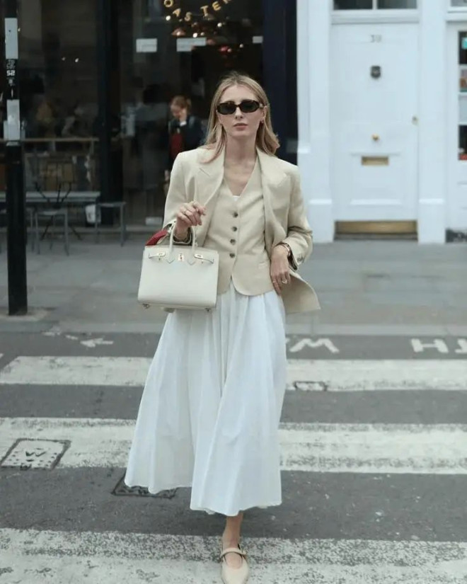 也可以选择百褶裙来搭配西装夹克, 优先选白色、米色,比如灰色西装配白色百褶裙,展现出优雅的气质。