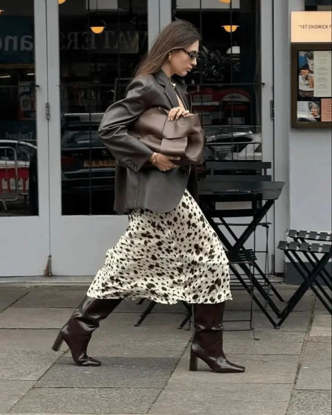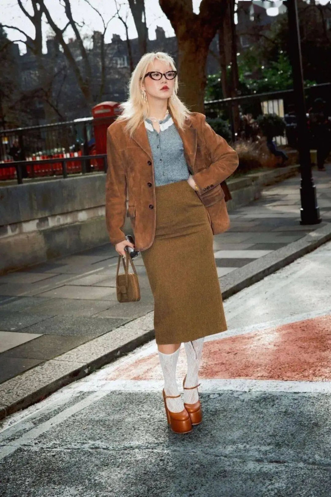 棕色系西装夹克配直筒半裙,既能满足通勤的正式感,又能靠同色系的和谐感穿出高级气质。