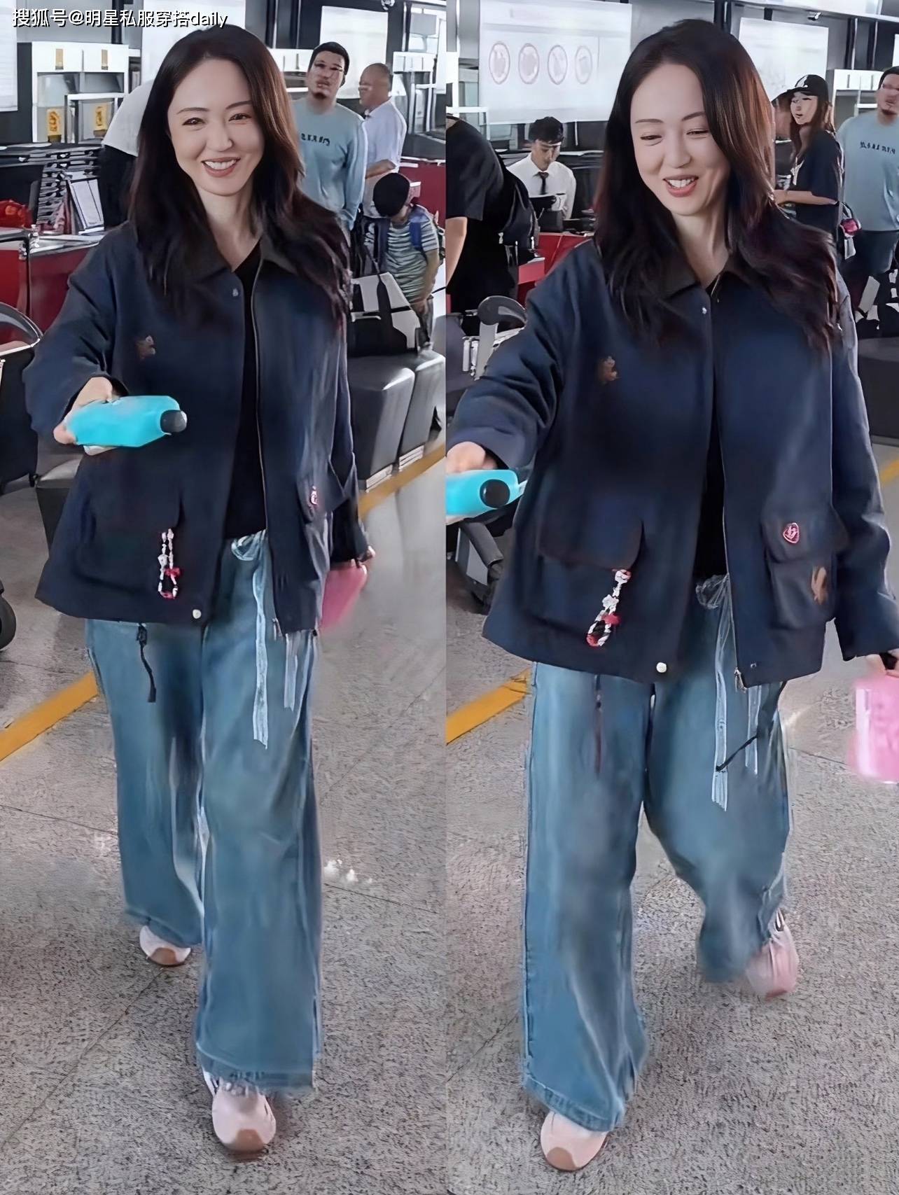 董璇在机场总是很宠粉,身穿蓝色巴恩风夹克配牛仔裤,休闲有型!脚踩粉色流心糖鞋,成为点睛之笔,甜酷吸睛!不得不说,再婚后的她甜蜜十足!