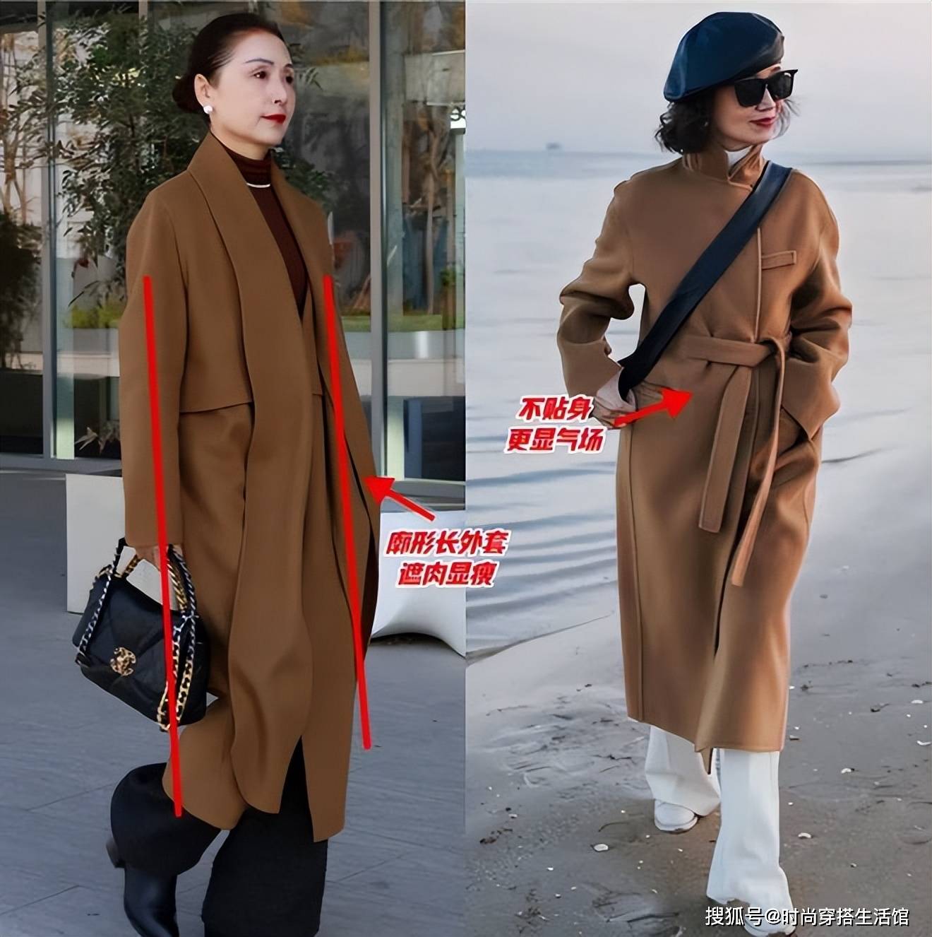 H型大衣的版型“直上直下”,对身材的包容度极高,很适合腰腹部微胖的阿姨。 X 型大衣则比较适合苹果型身材的女人,收缩的腰部设计能转移视线,塑造出咱们的身材曲线,看起来更有女人味。