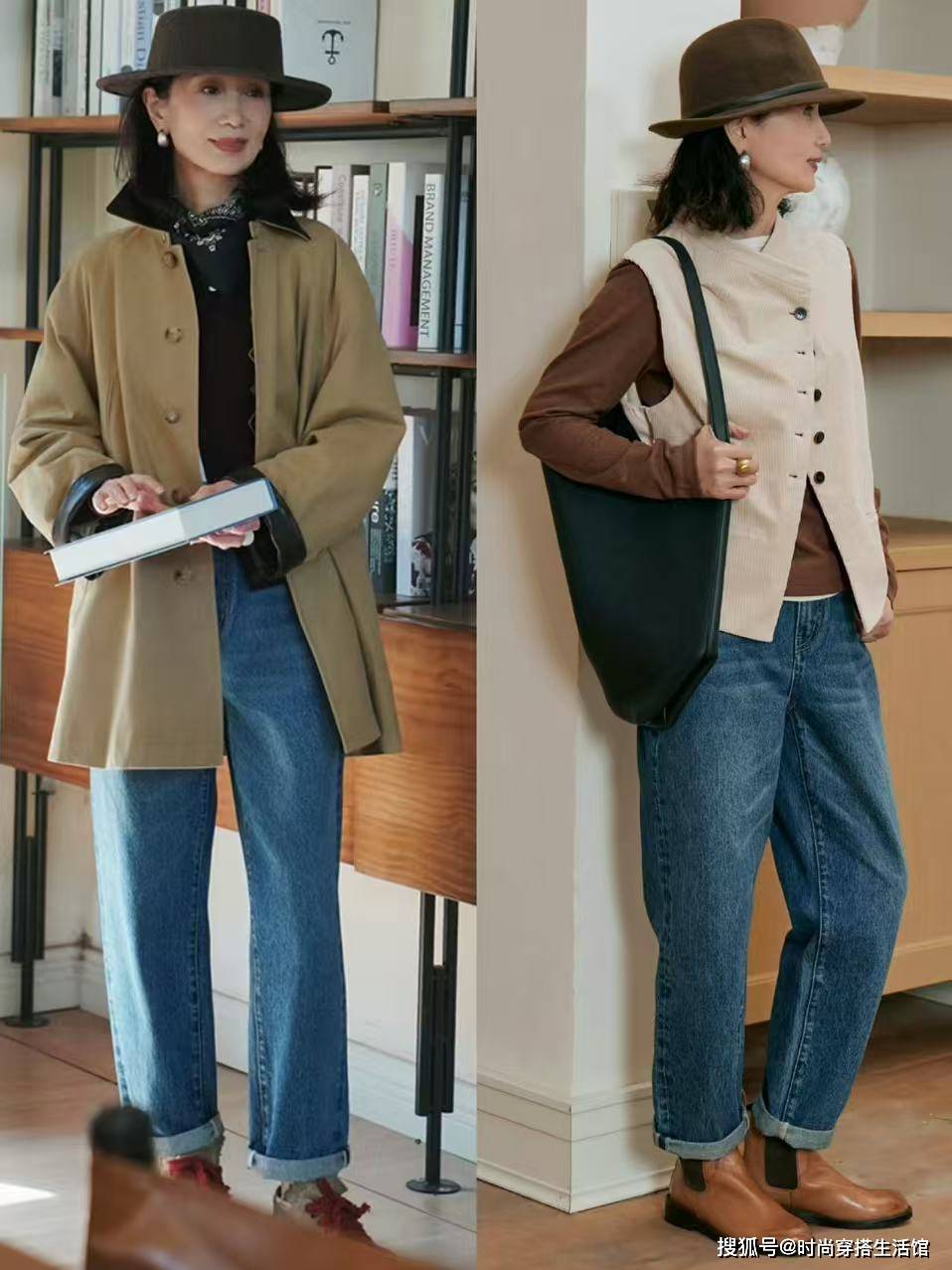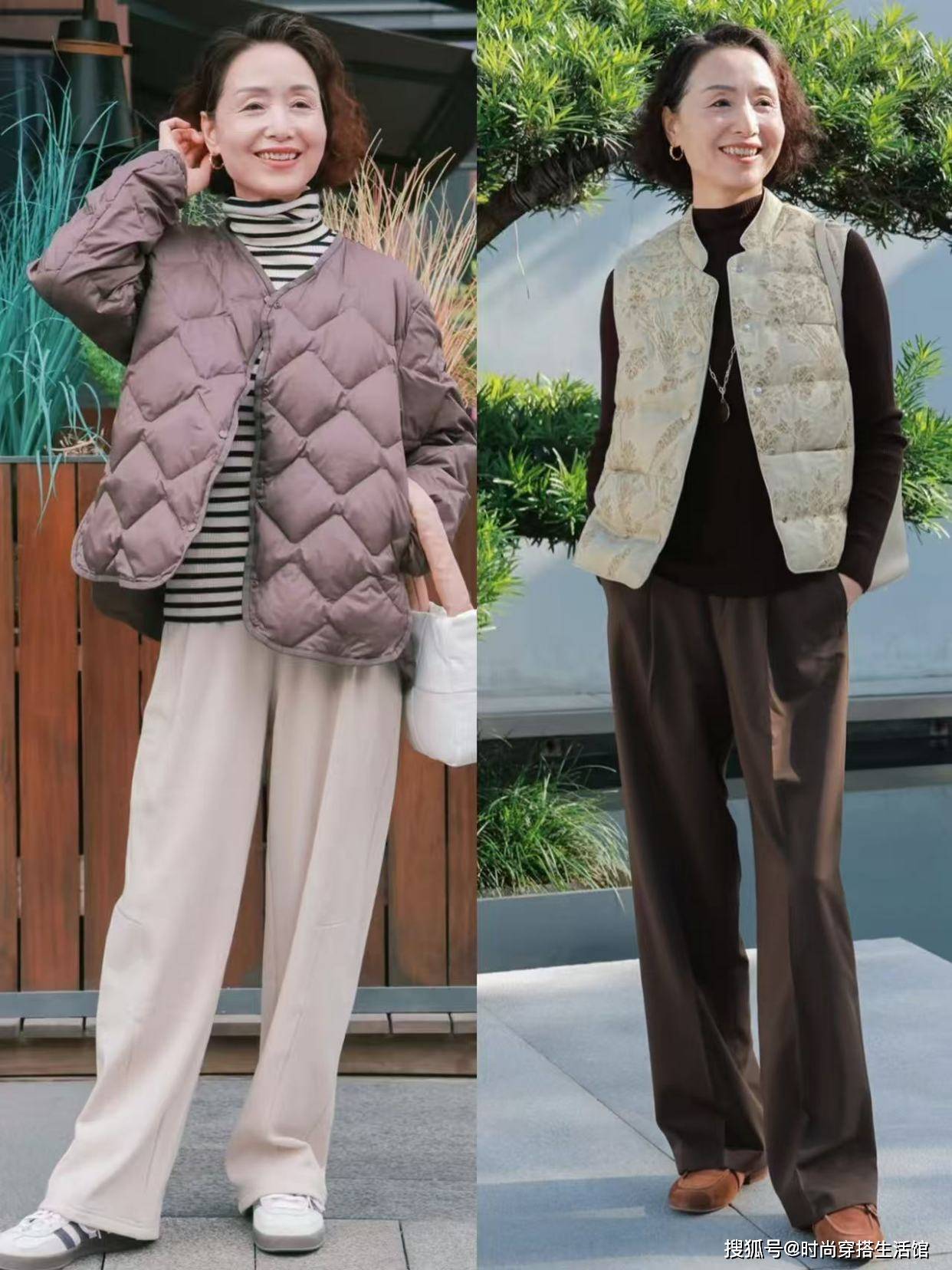 叠穿手法在“四六法则”中也是比较常见的,不过像这种搭配手法,就要采用“上衣塞腰”的方式了,基础款的内搭塞进腰身,在叠穿一件挺括有型的遮臀外套,不仅可以提升造型的层次感,而且遮肉效果也更加显著。对于五六十岁的大龄妈妈来讲,叠穿更有利于衣品的提升,可以轻松玩转高阶穿搭。