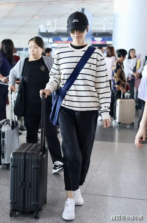 袁泉这一身搭配中选的米白+藏青条纹针织衫是合身微松款,肩线刚好贴住肩膀,不会像oversize那样松松垮垮,细条纹的密度刚好,既体现了层次感又不杂乱,领口露出一点脖颈线条,让整个人显得更舒展。