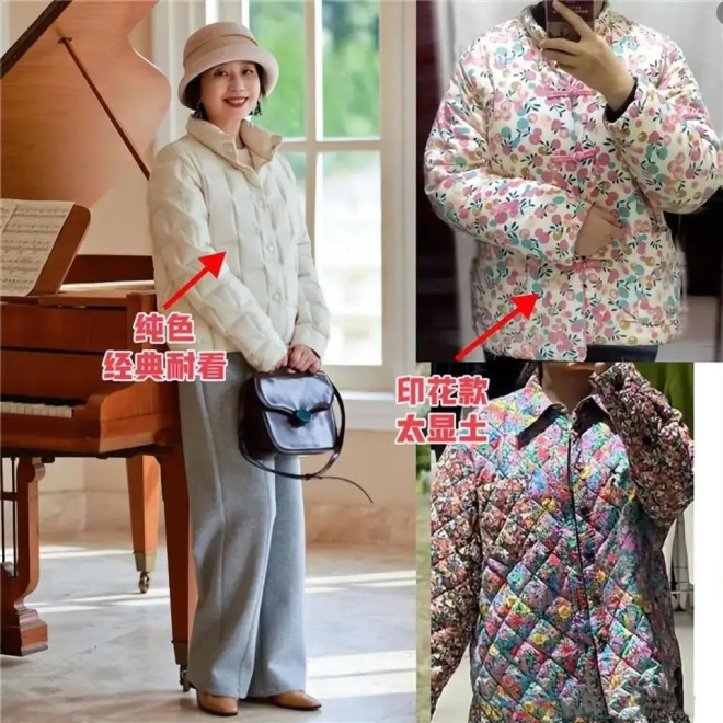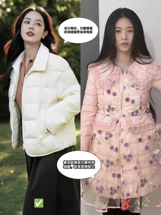 衣服设计过于繁杂,元素过多,这种衣服很容易变成精致土,有的时候选择衣服越简约,元素越精简,这样的羽绒服更好驾驭,也更好搭配。