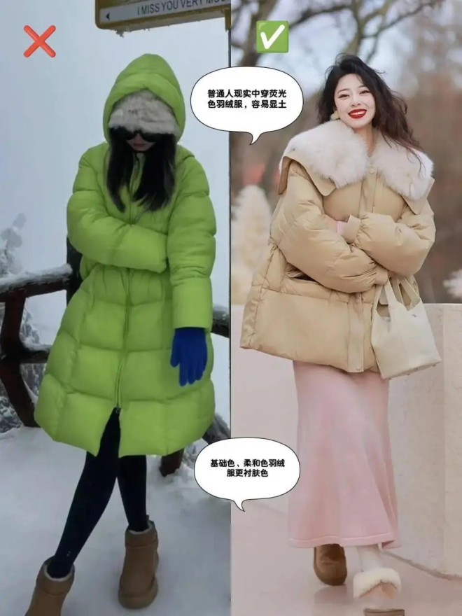 当然啦,也不是说颜色是纯色的,就一定好看,例如下面这一件绿色的羽绒服,这样的色彩羽绒服穿在身上并没有那种时尚感,还不如选择浅驼色的羽绒服,这种基础色,柔和色的羽绒服更容易修饰肌肤,让你显白显嫩,再搭配上一条粉色的直筒半身裙,脚上穿的一双保暖靴,或者是雪地靴,轻松让你变美变洋气。
