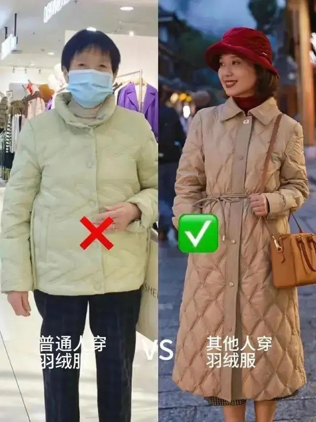 咱们穿羽绒服,第一个需求就是保暖,但达到保暖之后,其次就是如何把它穿出时尚感,咱们就看下面的普通人穿羽绒服,整个人显得臃肿显胖还显老。
