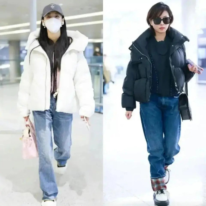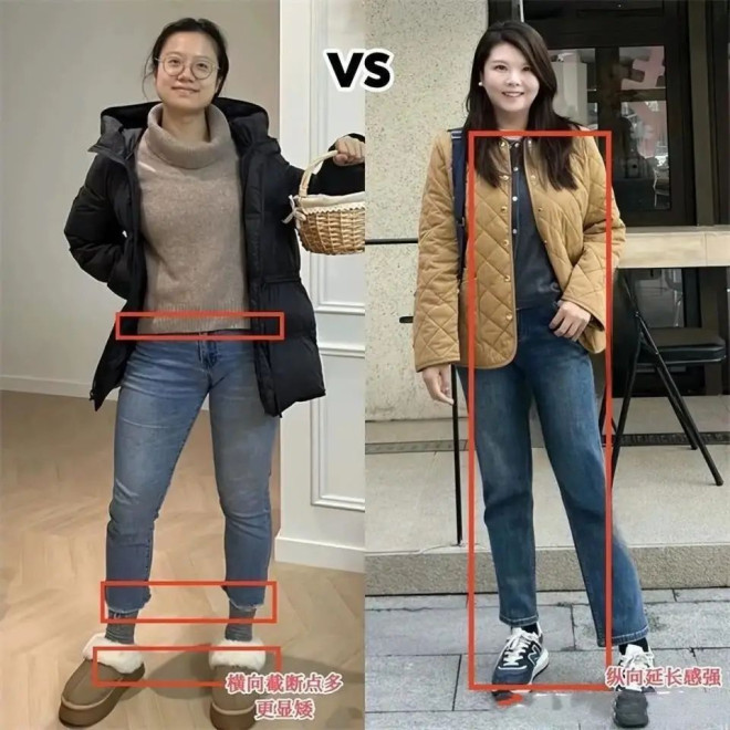 我们在选择羽绒服的时候,一定要适合自己的身材,那么就要了解自己是属于偏瘦还是偏胖?但不管如何,一定要做到穿松不穿紧,例如下面这两条牛仔裤,一条是紧身牛仔裤,另一条是直筒牛仔裤,紧身牛仔裤暴露了小肚腩,胯宽腿粗等问题,就算搭配了黑色羽绒服,显得廉价又土气。