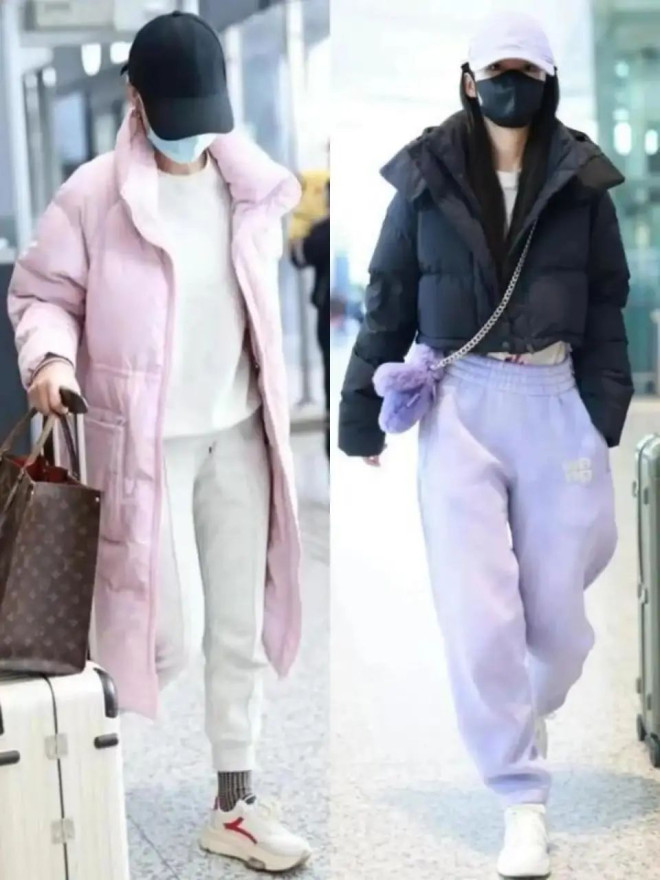 其实我们在这个冬季还可以直接选择走那种休闲的穿搭风格,例如下面用一条浅紫色的运动裤搭配上短款的黑色羽绒服,脚上穿了一双小白鞋,这样的穿衣打扮就属于上短下长的搭配方式,看起来也很洋气,还显年轻。