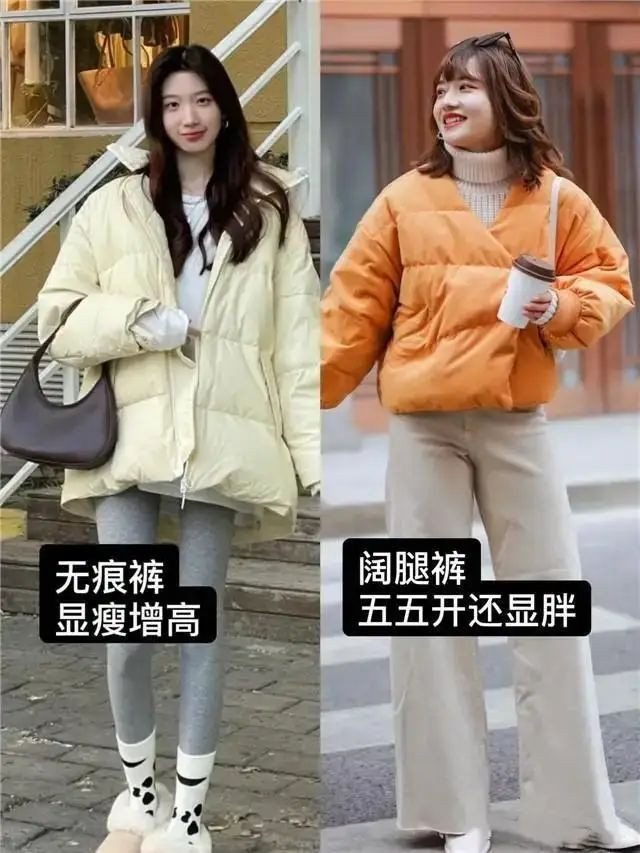 天生就腿粗胯宽,这时候你就无法穿无痕裤了,应该选阔腿裤,阔腿裤搭配还能遮住腿部的缺点。但是千万不要选择短款的羽绒服来组合,要不然的话会使得你身材比例形成一个五五开。