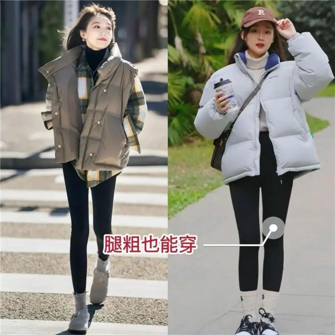 有一些女生天生腿型就比较好,这时候你可以用无痕裤来搭配上长款的羽绒服,能达到显瘦增高的效果。