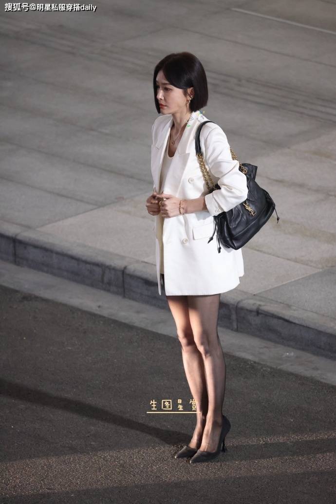 秦岚的第二套 “西装 + 黑丝” 造型,选择了经典的白色西装。上身的白色西装外套版型利落,线条流畅,自带干净清爽的气质;内搭的白色圆领 T 恤则进一步强化了简约感,避免了西装的正式感过于沉重。