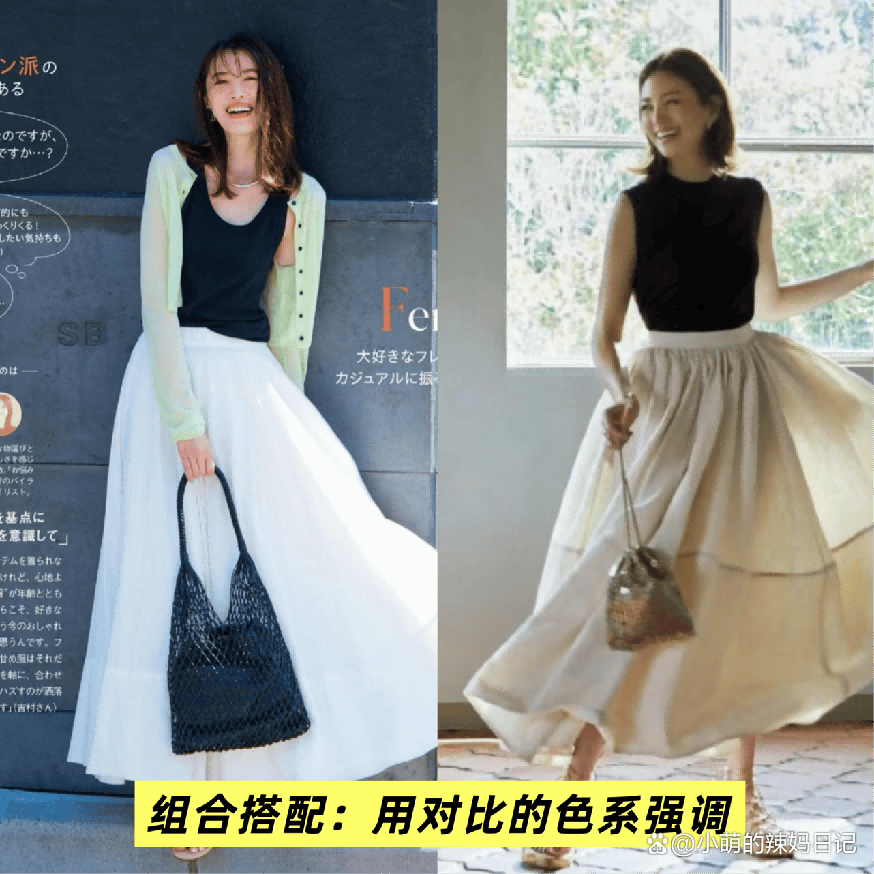 想要在视觉上进行强调的话,那么我们上半身单品和下半身的裤装或者是裙装的搭配就可以运用比较有差异的色系,例如像黑白的对比又或者是基础设计和彩色调的搭配,再次对上短下长的比例分割进行非常明显的强调效应,这对于小个子的女性而言真的很建议大家将其码住!