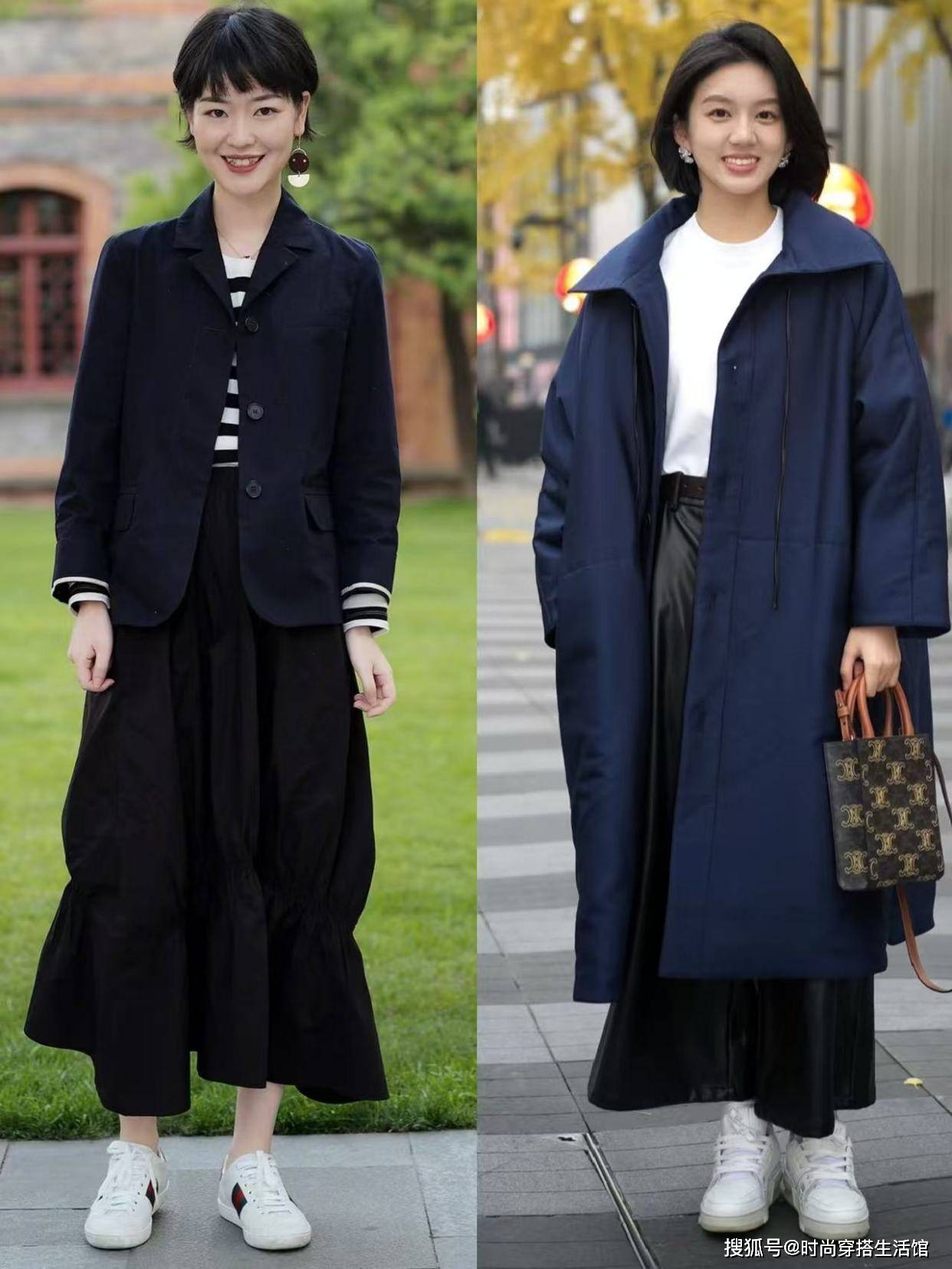 运动鞋的组合,可以削弱女性身上的冷冽姿态,与半身裙的温柔浪漫柔和。这种一半优雅、一半随性的穿着方式,大气又不挑人,年轻女人、中年女人都可以完美驾驭。
