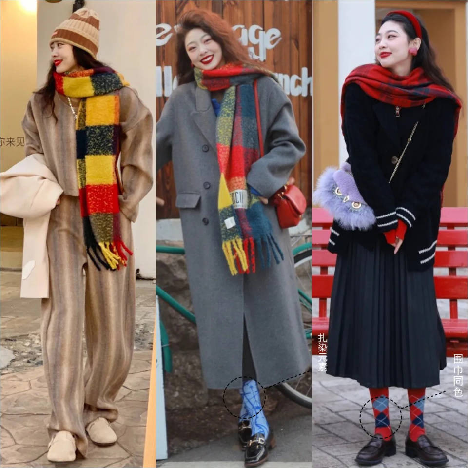 年轻貌美的你可以尝试彩色系拼接在一块的围巾,例如上面这几条围巾搭配上大衣外套就能让人看起来超有活力感,打破了风尘仆仆的即视感。