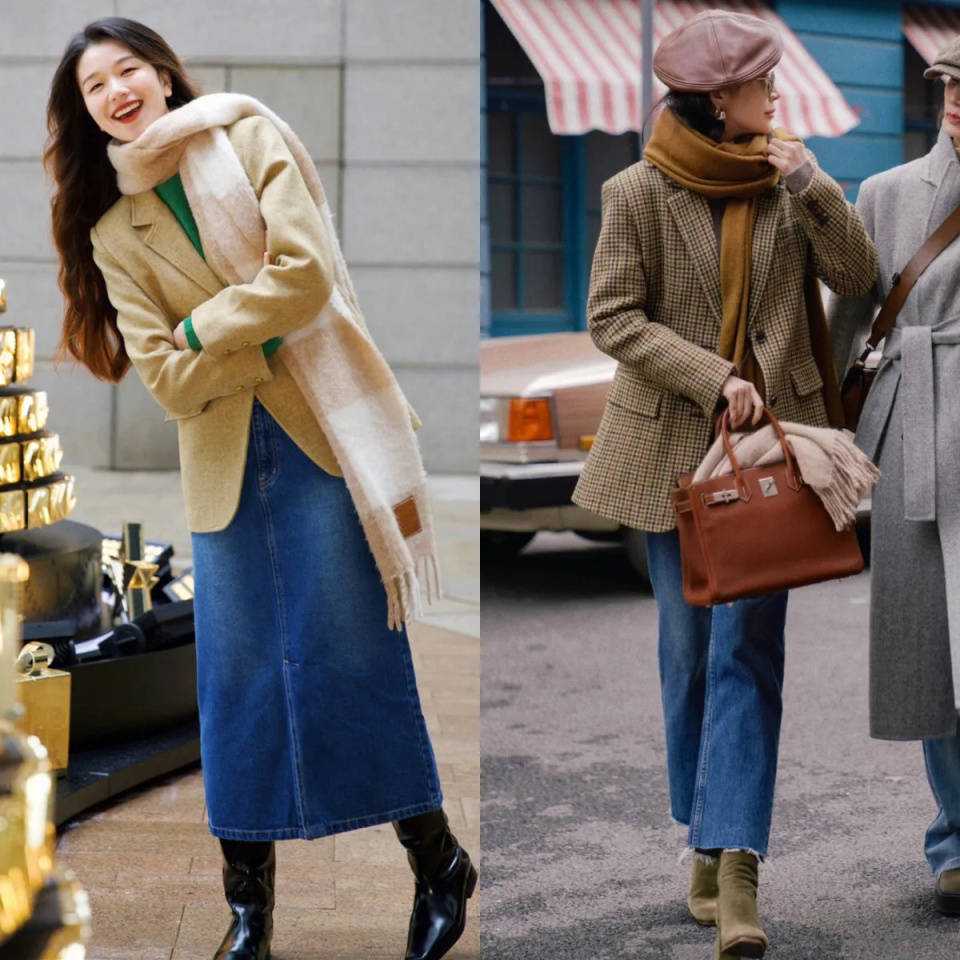 学“三木博主”的极简风穿搭,能让你的搭配降低出错率,百搭耐看的驼色围巾,搭配格纹西服,加上天生拥有时尚元素的牛仔裤,让造型更添精致一笔。