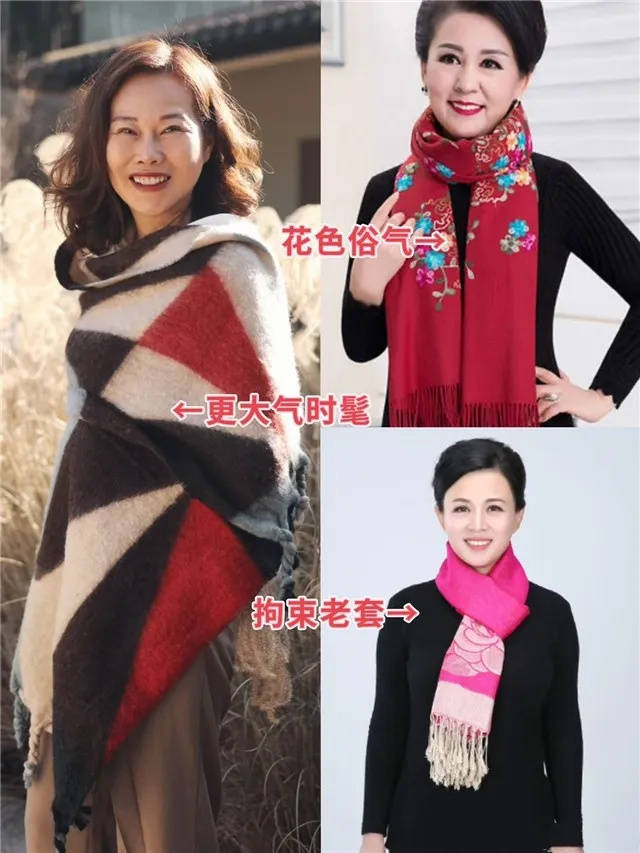 等自己老了,绝对不戴花哨款围巾,也不拘束老套的佩戴方式,显得俗气老气。不像左边这一套围巾,一眼看上去就很大气时尚。