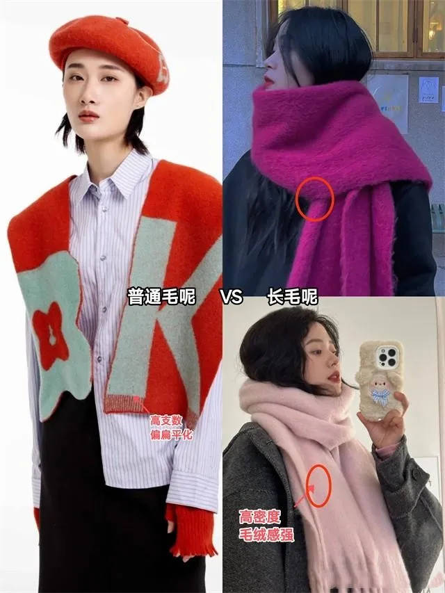 还不如选择“长毛呢”的围巾,高密度毛绒感会更强,戴在脖子上也会很舒适,保暖性强,戴法也会变多。