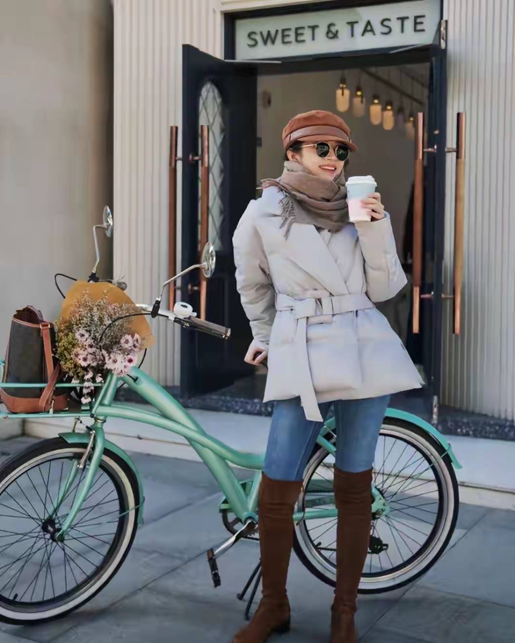 拥有凹凸有致和大长腿的你,就可以借鉴三木博主的穿搭方式,例如上面就用了一件做了高腰收腰设计的灰色羽绒服,搭配上经典款的蓝色紧身牛仔裤,脚上穿的一双深驼色的长筒靴,就能呈现出她大长腿的优势,抢眼又抢镜。