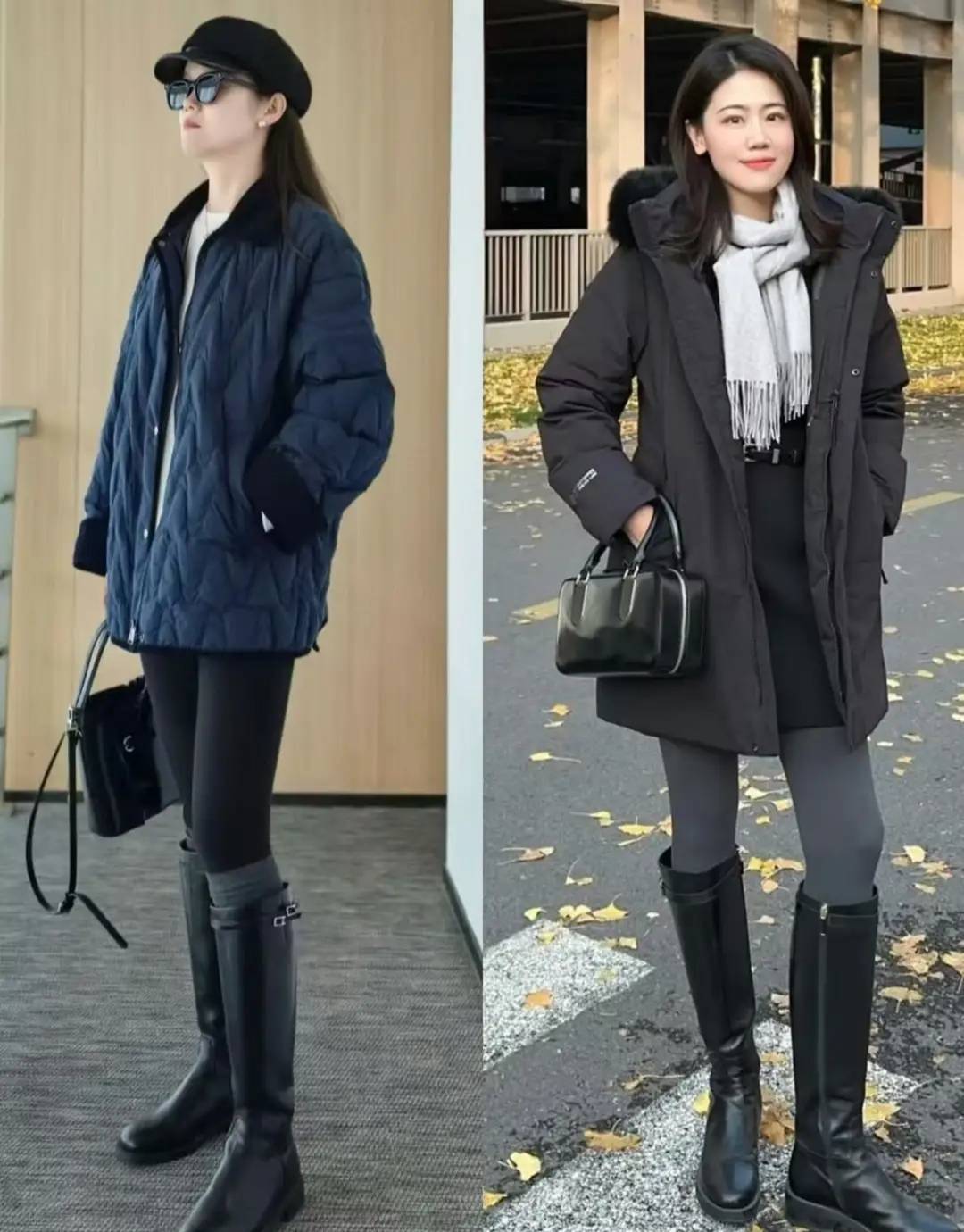 如果你想尝试穿无痕裤,这时候尽量做到选择最为纯色系或者是基础色的衣服来搭配,例如上面就用灰色羽绒服和白色羽绒服来搭配上无痕裤脚,穿一双黑色中筒靴,这样的穿搭出门不光保暖,而且很时尚。