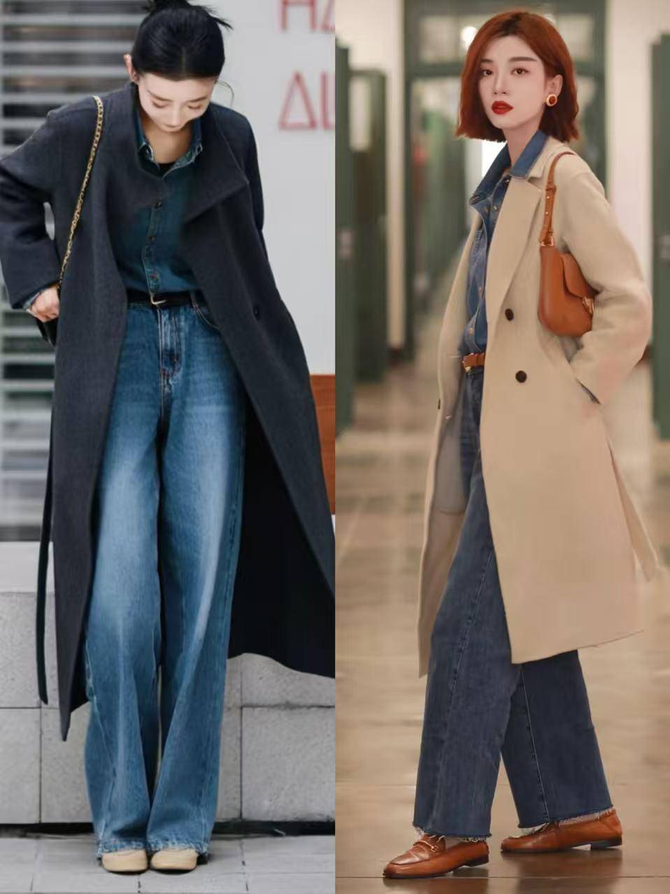 ①:黑色灰色大衣搭配蓝色牛仔阔腿裤
