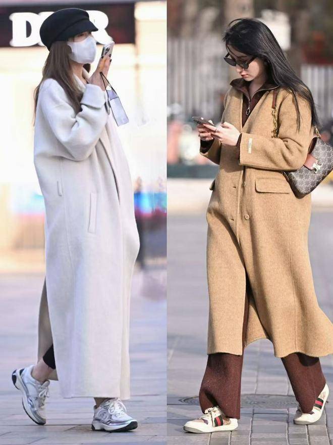 上面这两位杭州女生用一件驼色大衣搭配白色牛仔裤,脚穿棕色短靴,另一位是用灰色大衣内搭黑色针织衫和一条蓝色的牛仔直筒阔腿裤组合,脚上穿的粗跟的单鞋,这样的穿搭保暖舒适,简约干练。