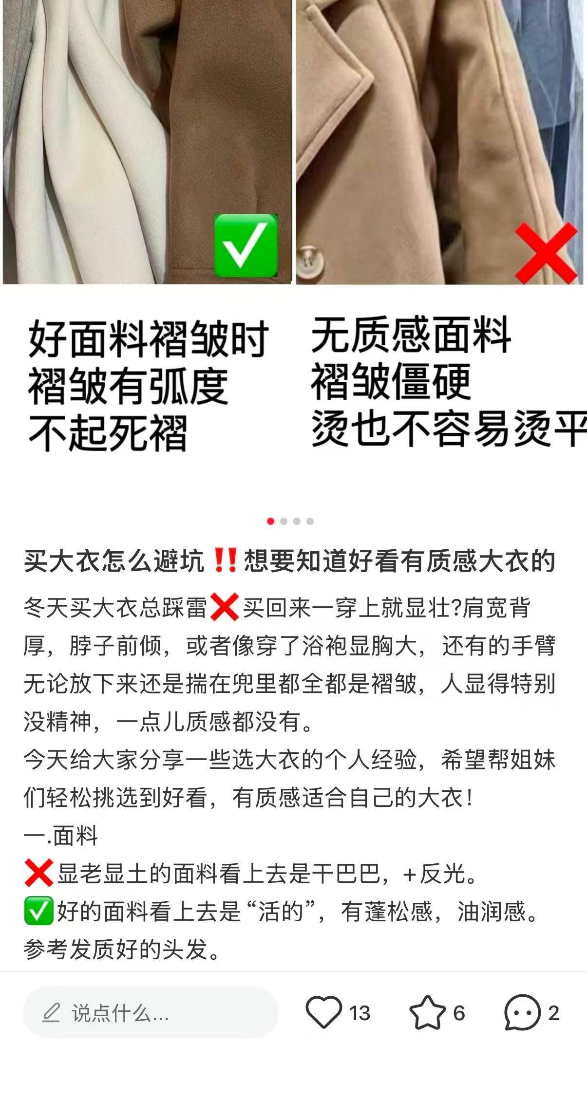 咱们买大衣外套一定要懂得看面料,好的面料即使褶皱时褶皱都有幅度,不会变成死褶。