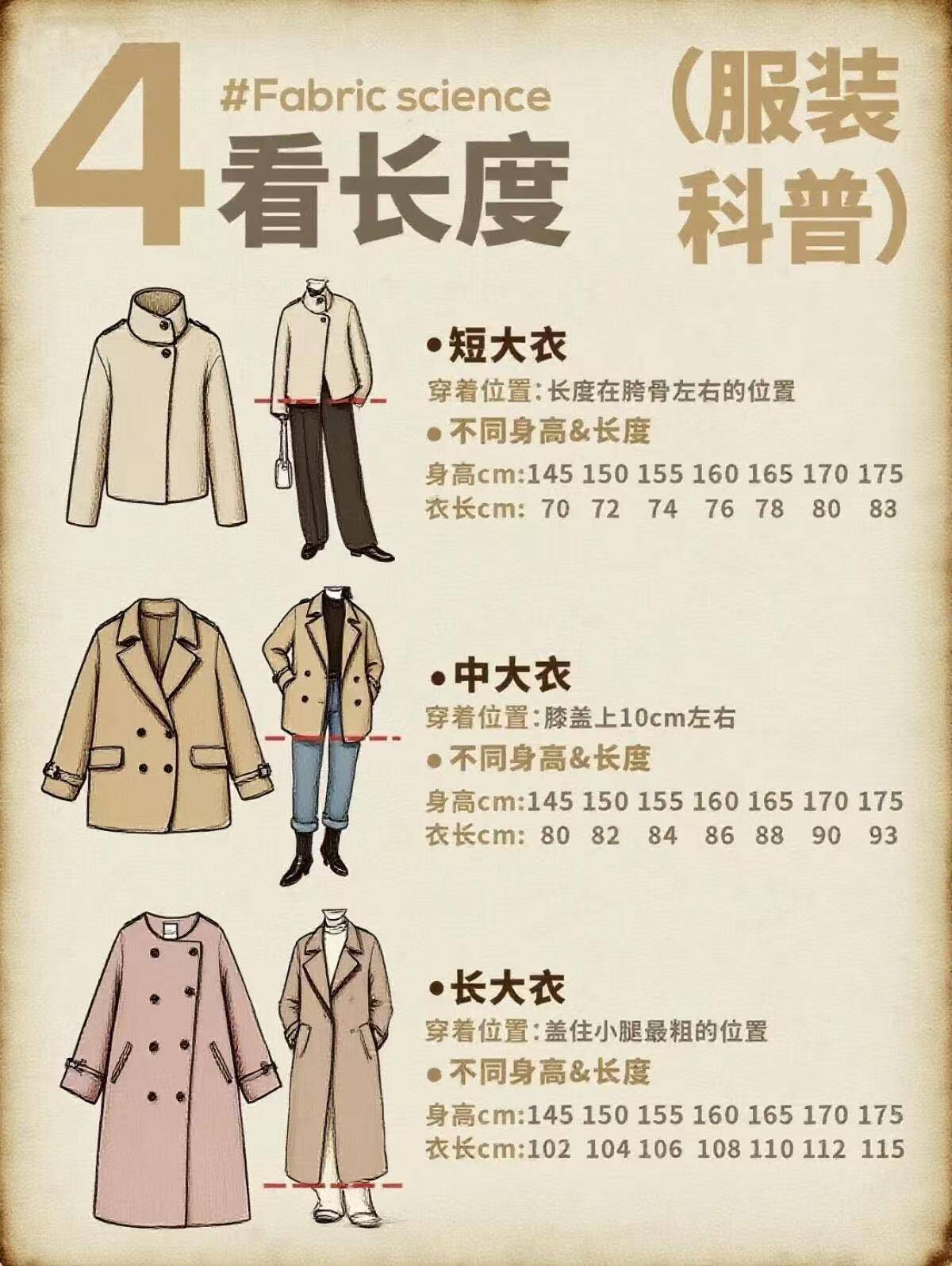 身高不同,选择的大衣长度自然有很大的区别,如果实在不知道自己选短大衣和中大衣,长大衣的长度比例,你看上面这张服装科普图,相信就能找出你想要的答案。