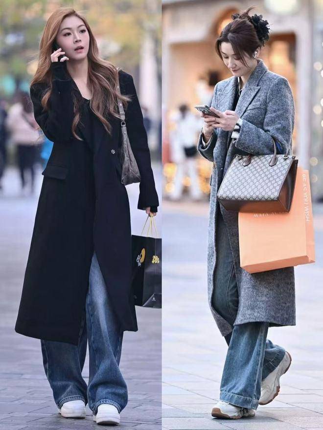 其实有的时候我们的穿搭用最为基础的色调,呈现出来的效果反而更大气,例如上面用黑色大衣和灰色大衣来搭配上蓝色牛仔裤,脚上穿的一双运动鞋,老爹鞋,小板鞋,这样的打扮简约干练又拉风。
