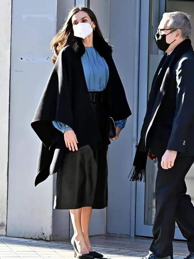 我们接着再来看一下西班牙王后莱蒂齐亚,用的是比较个性的黑色大衣,内搭一件不对称设计的高腰收腰款衬衫和一条比较有品质的黑色皮质半身裙,脚穿黑色的浅口高跟单鞋,她直接选择了最为基础的黑白色搭配,但她的衣服品质很好,设计也很时髦,所以穿在身上才会有这么强大的气场和时尚感。