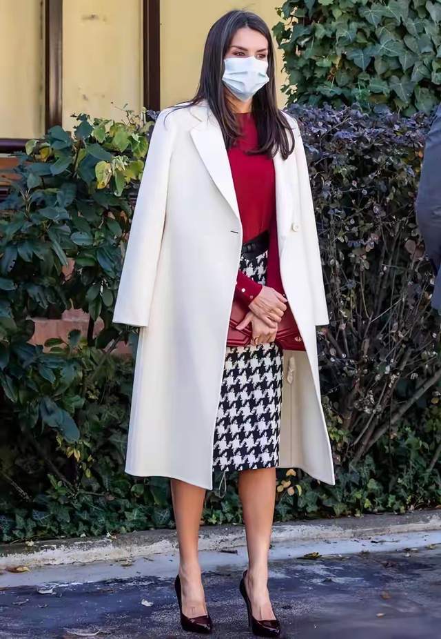 例如,西班牙王后就选择了一件非常简约的白色翻领大衣,内搭红色的针织衫,加上一条黑白格纹的直筒半身裙,脚穿棕红色的浅口高跟单鞋,这样的穿衣打扮就能很好的呈现出“来蒂齐亚”高挑纤瘦的身材。