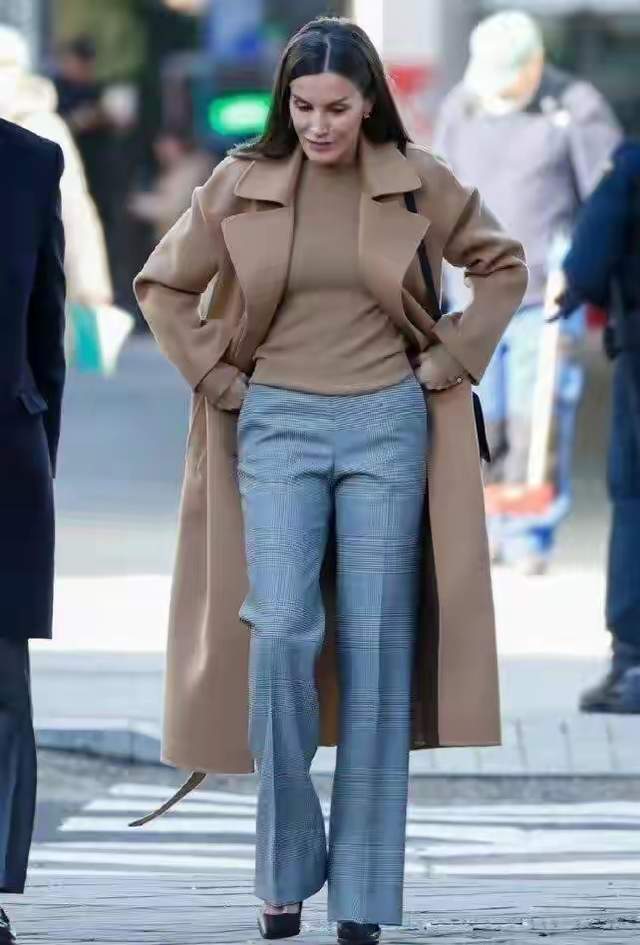 西班牙王后莱蒂齐亚的裤装搭配大衣还是非常好看的,例如上面这条灰色的直筒西装裤,搭配上驼色大衣外套和针织毛衣,这样的搭配很适合咱们日常出行穿搭,或者是上班的时候搭配也完全没有任何问题。