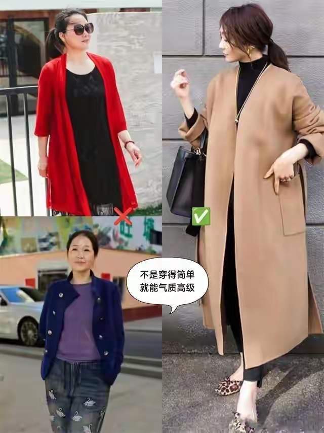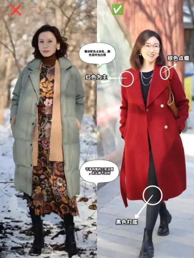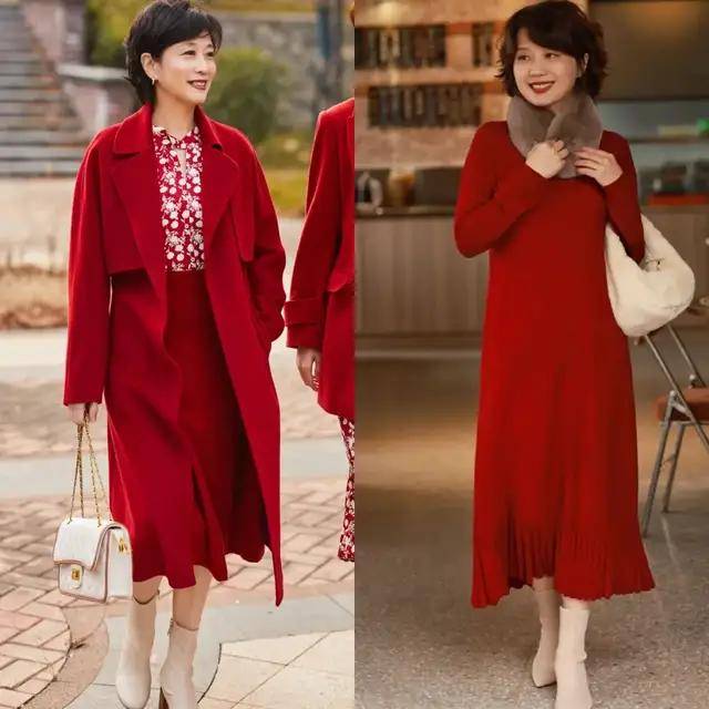 就算你内搭的衣服也尽量不要选择花色的衣服,过于花哨,很难搭配,有的时候我们直接选择最为经典的红色大衣搭配黑色裙子,反而更容易提升整个人的气质,同时,这样的配色比较适合咱们中年女性,简约大方。