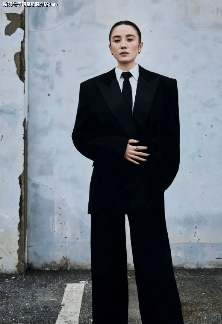 喜欢垫肩外套的,不要错过廓形西装外套,宋佳身穿黑色廓形西装外套,搭配白色衬衫黑色领带,霸气侧露!这种版型的西装对于身形要求高!建议高个子尝试,小个子,可以尝试下半身失踪式穿搭!