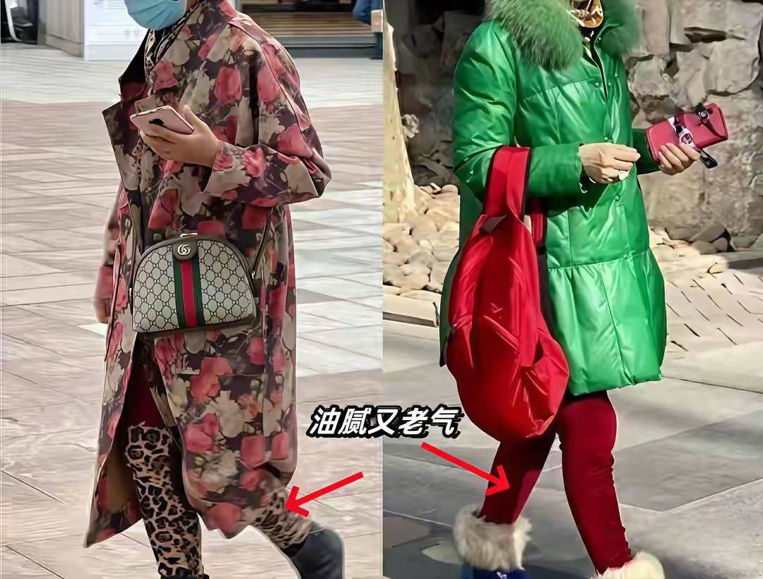 就好比如上面这2套穿搭示范选择豹纹的打底裤和红色的保暖打底裤,搭配上印花大衣和绿色羽绒服,瞬间穿出油腻感,老气横秋。