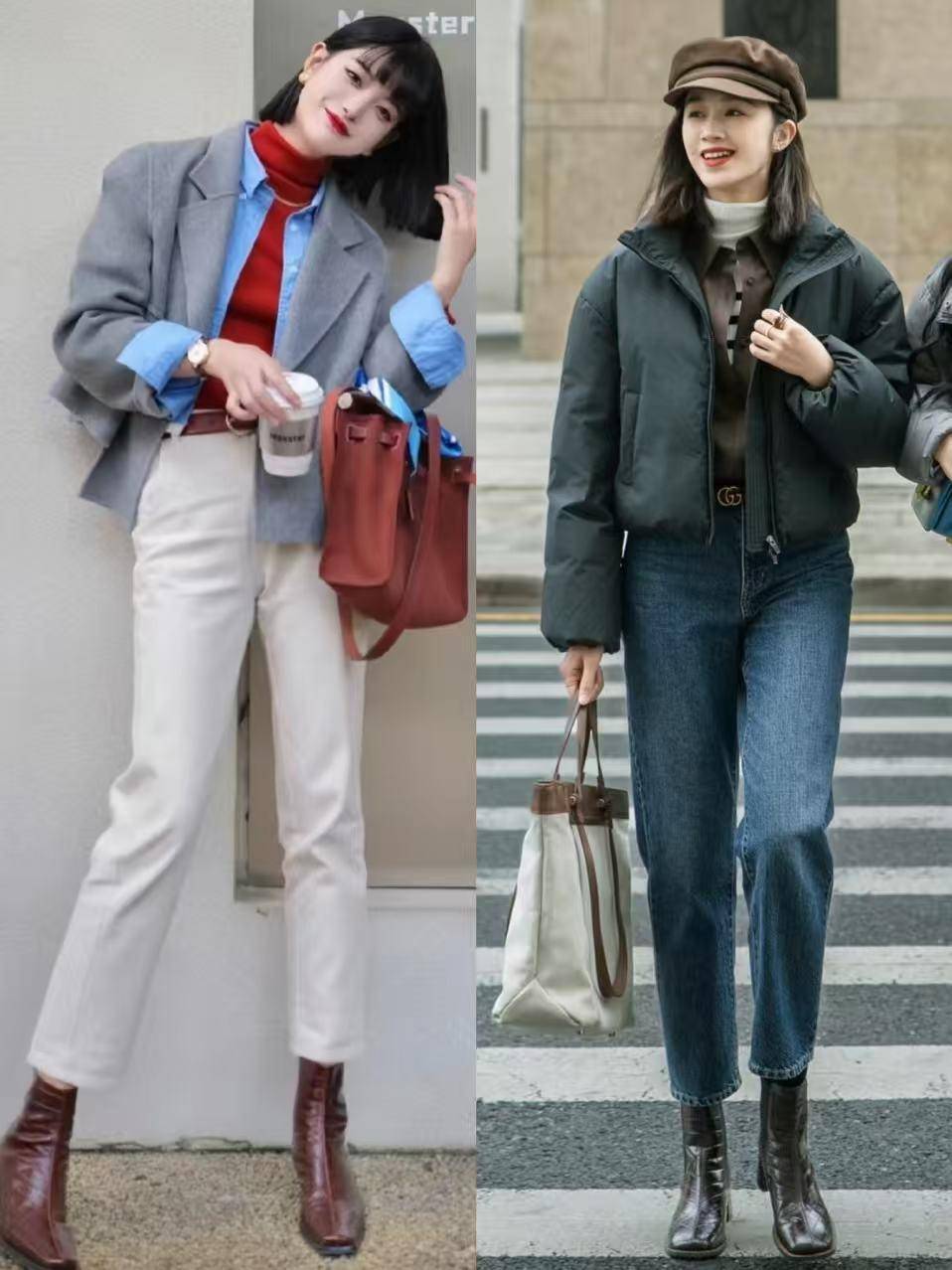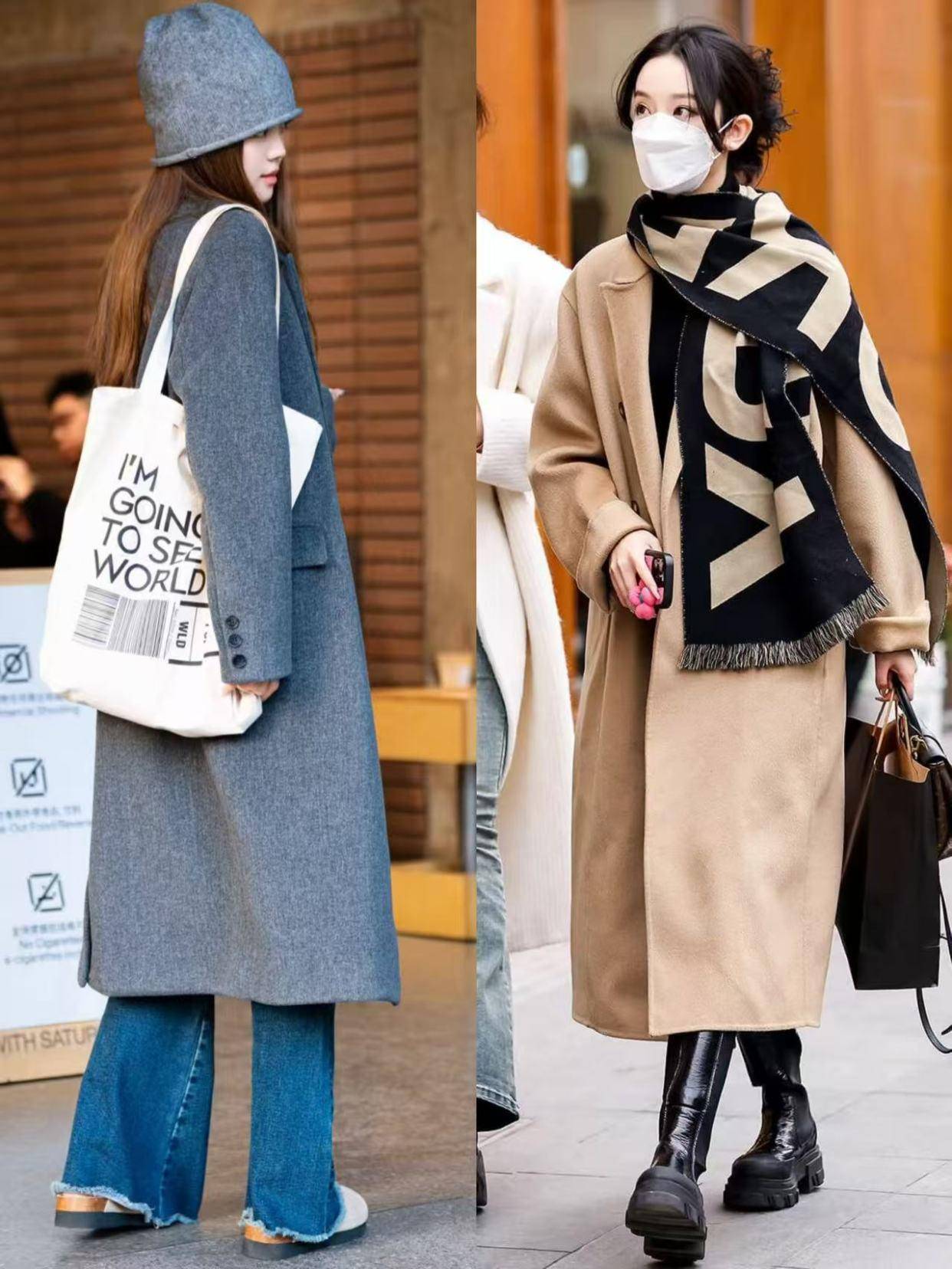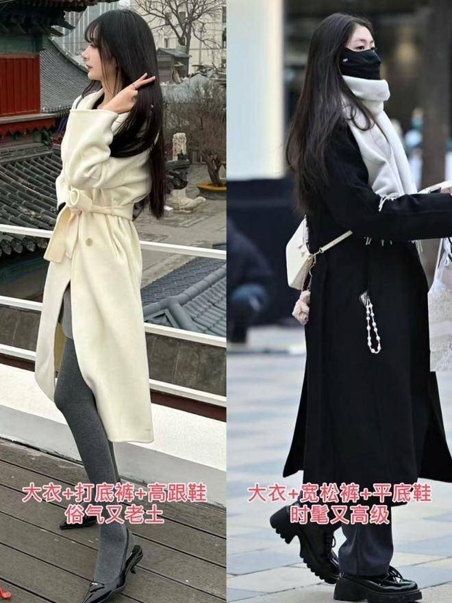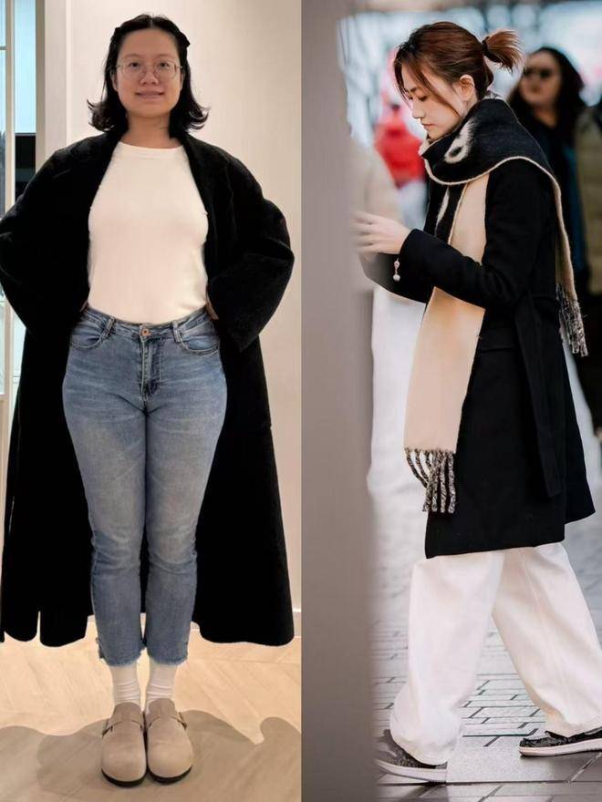 咱们就看上面这两位素人的穿搭对比就非常明显,一个是选择了牛仔紧身裤搭配上黑色的大衣外套,暴露胯宽腿粗等问题。
