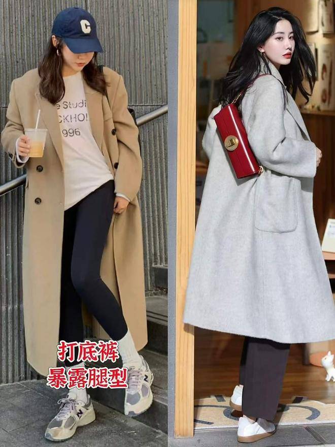 打底裤不是不能穿,而是对身材要求极高,甚至对年龄也有一定的要求,如果说像上面左边的这位素人博主用浅黄色的大衣搭配灰色打底裤和一双高跟鞋,年轻貌美的女生穿了确实还可以,但是当你放在40岁左右的中年女性来搭配就会显得俗气又老土。