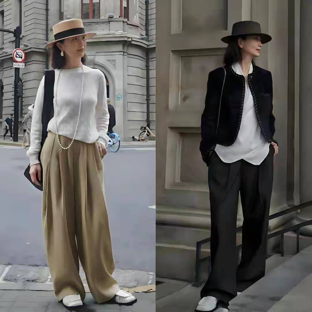 有的时候我们选择裤子真的不太分年龄,主要看你如何把控你的裤子品质和大小 ,比如上面用一条卡其色的阔腿裤搭配白色的毛衣,脚穿白色的乐福鞋,这样的穿搭慵懒随性。