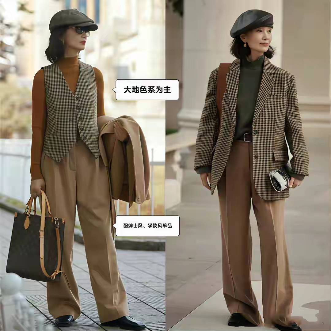 选择一条大地色系的西装直筒裤搭配t纹马甲,还穿针织毛衣,加上同色系的大衣外套,这样的搭配超级fashion,传达不光五六十岁的女性可以穿,25岁到30岁之间的职场女性采用这样的穿搭,让你变得更干练有气质。