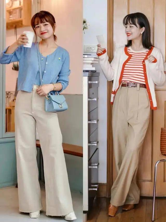 所以咱们一定要懂得做减法搭配,用一双纯色系的鞋子,比如说白色的短靴,或者是一双棕色的皮鞋,搭配上卡其色的阔腿裤,上衣是一件针织开衫,这样的搭配通勤又时髦。