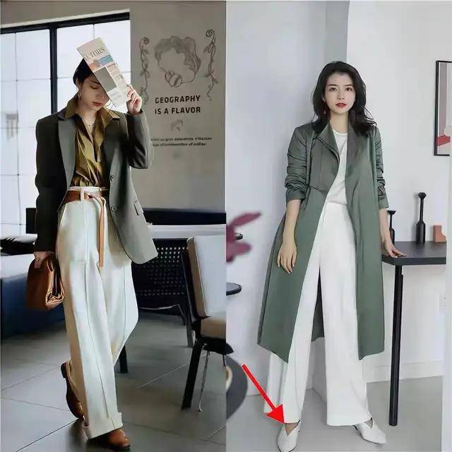 当我们选择非常干练精致的穿搭造型,西装来搭配阔腿裤穿就很不错,这时候如果想要更好的延伸腿部线条,你可以选择一双白色的浅口单鞋,露出一点肌肤确实更容易延伸腿部线条。