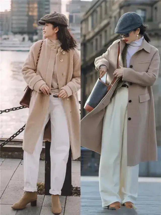 当然,我们想要保暖舒适的穿搭,直接选择一双低跟的驼色皮鞋来搭配就够。因为想要让自己的腿型比较修长,还可以把内搭的衣服塞进裤子里面,再勒上一条腰带,就能形成高腰线,身材比例也可以形成三七分,显高显瘦。