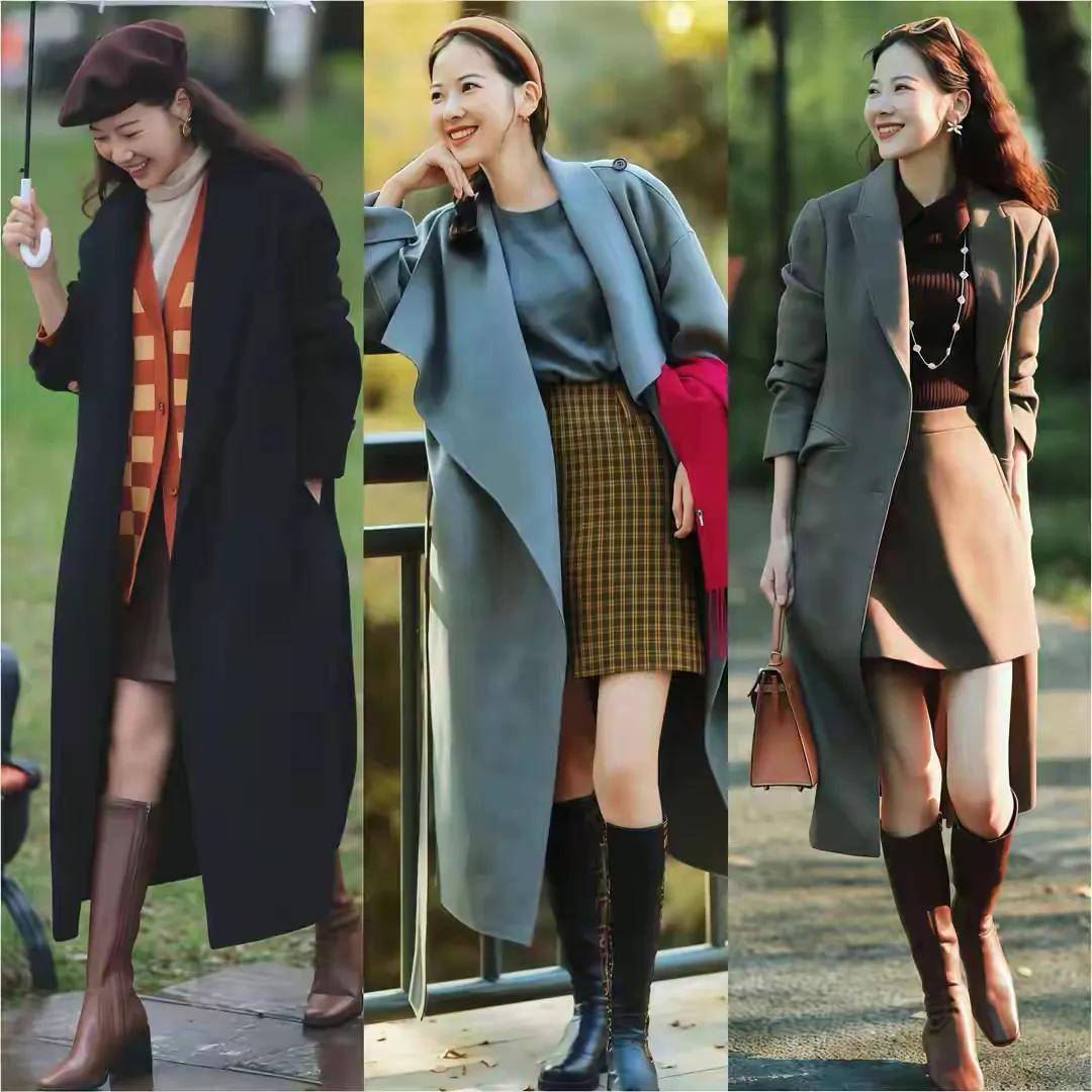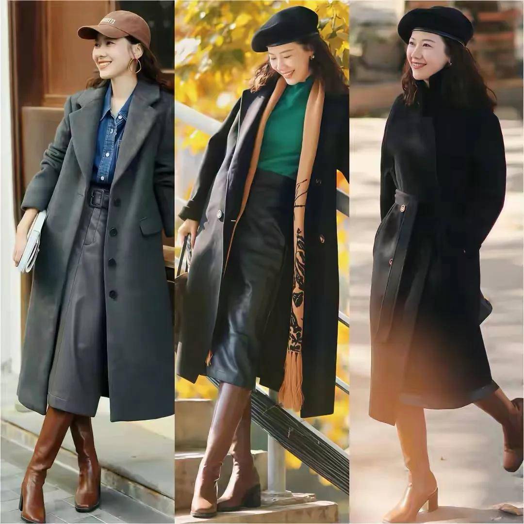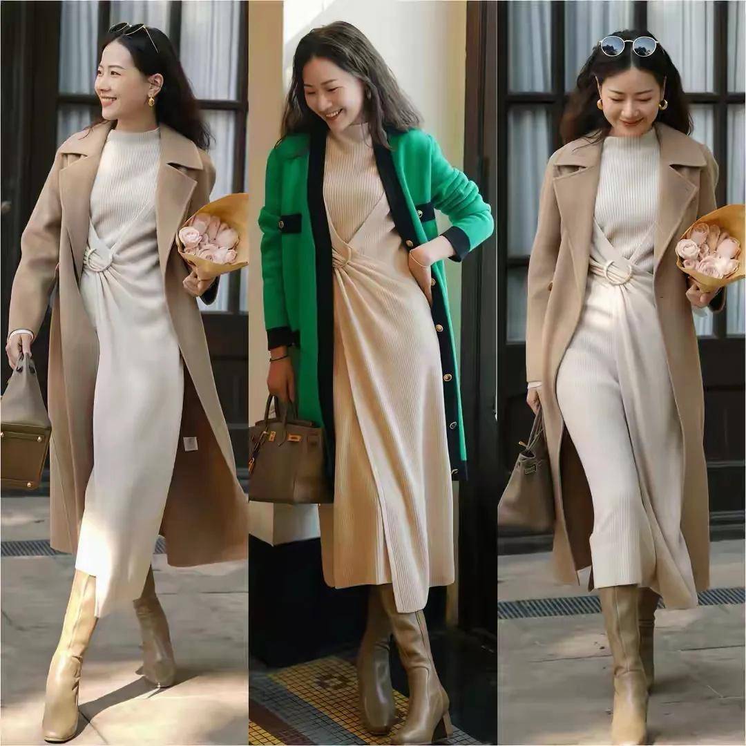 例如,上面就用了驼色大衣外套,搭配上半身裙就要穿长筒靴,轻松呈现出御姐的气质范。