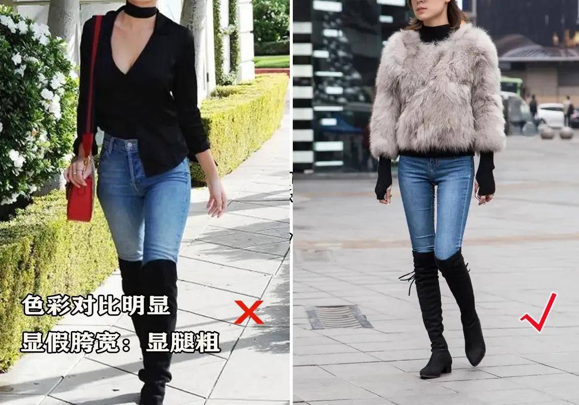 整体的穿衣打扮色彩也很讲究,比如你本身是穿了一条天生就拥有时尚元素的牛仔裤,想要穿出休闲感,但当你脚上穿的是一双黑色的长筒靴,上衣也是黑色的针织开衫。这时候中间的位置蓝色牛仔裤就很容易暴露假胯宽和腿粗问题。