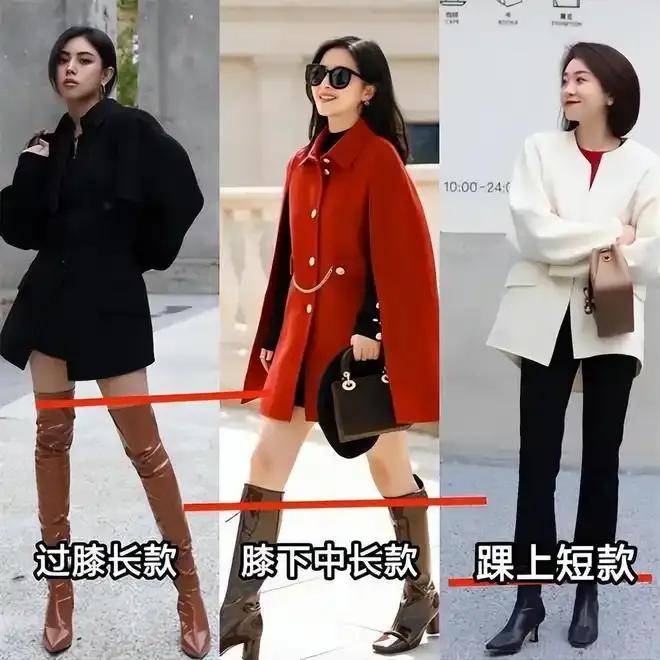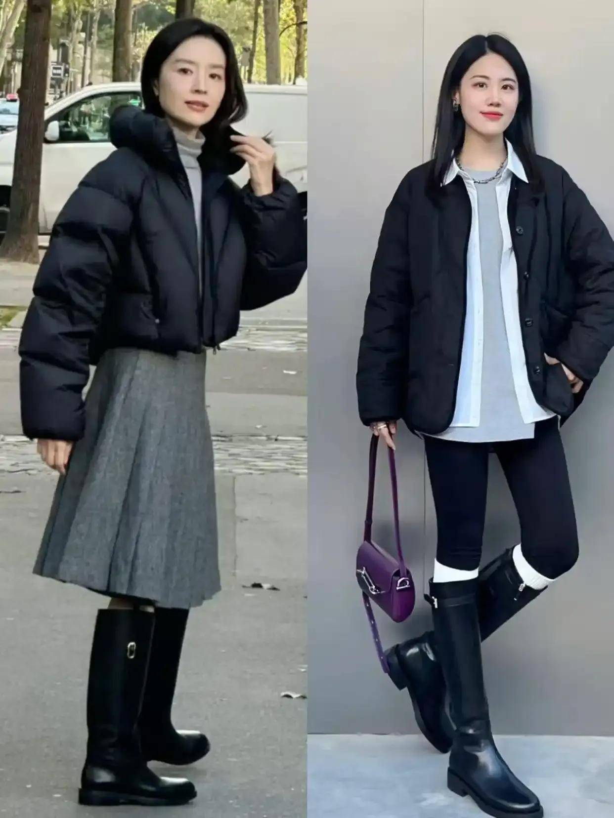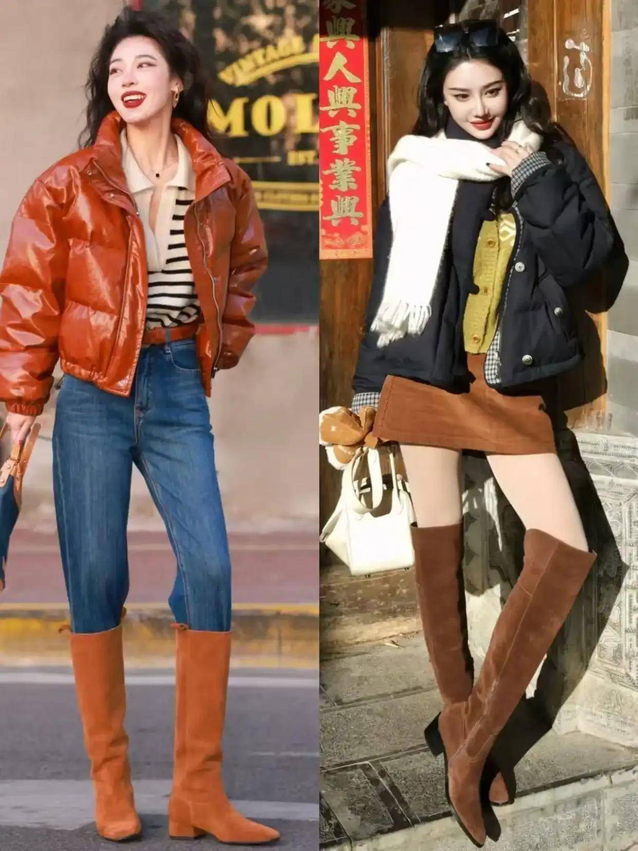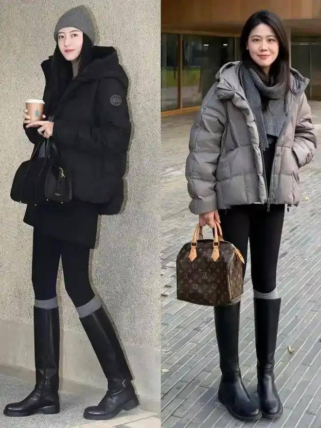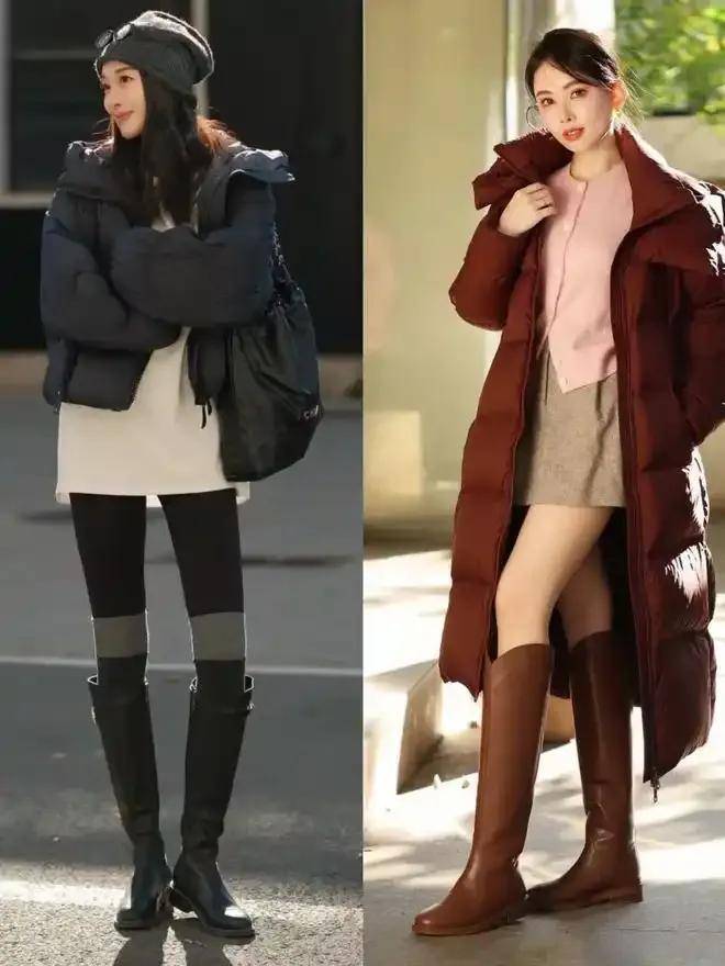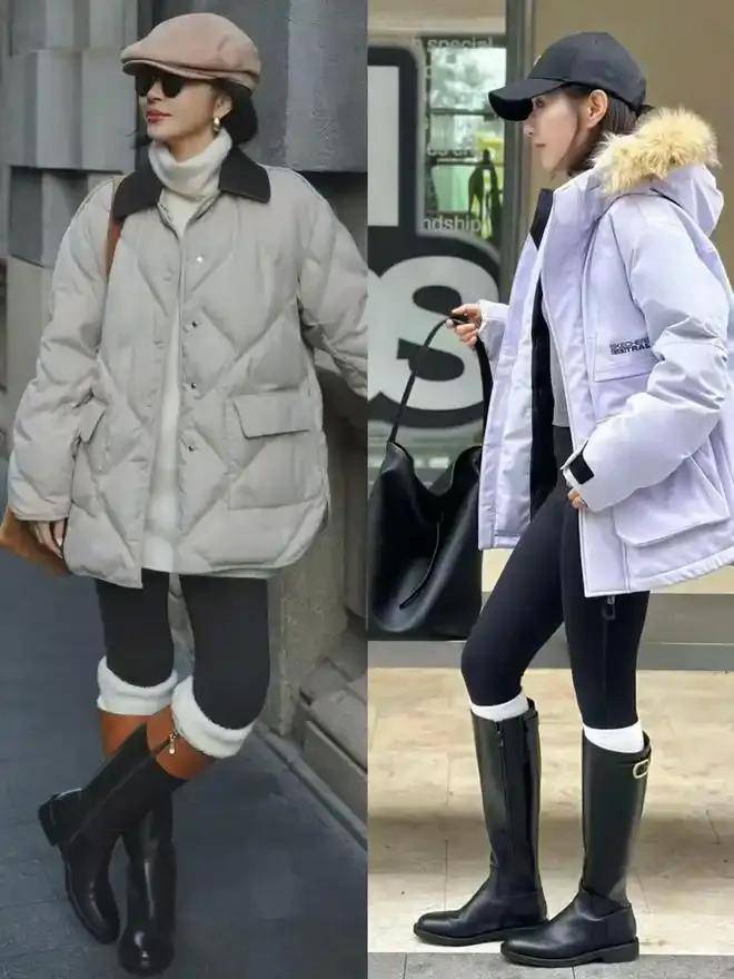 寒冷的冬天,选择大衣外套、羽绒服外套搭配长筒靴,是今年最受欢迎的御寒组合,既能遮肉显瘦又高级感十足。穿羽绒服的时候,记得别穿窄衍缝款式,穿大衣外套时,不穿容易起毛、起球的款式。